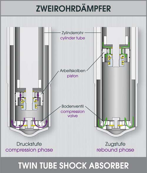 | 所有的ST Suspensions與KW避震器一樣,都是複筒式結構,因此內部可設計兩道阻尼閥門,讓避震器於低速時擁有良好的舒適性,高速時又能提供絕佳的高阻尼反應,較單筒式避震器提供更全面的適應能力。 |