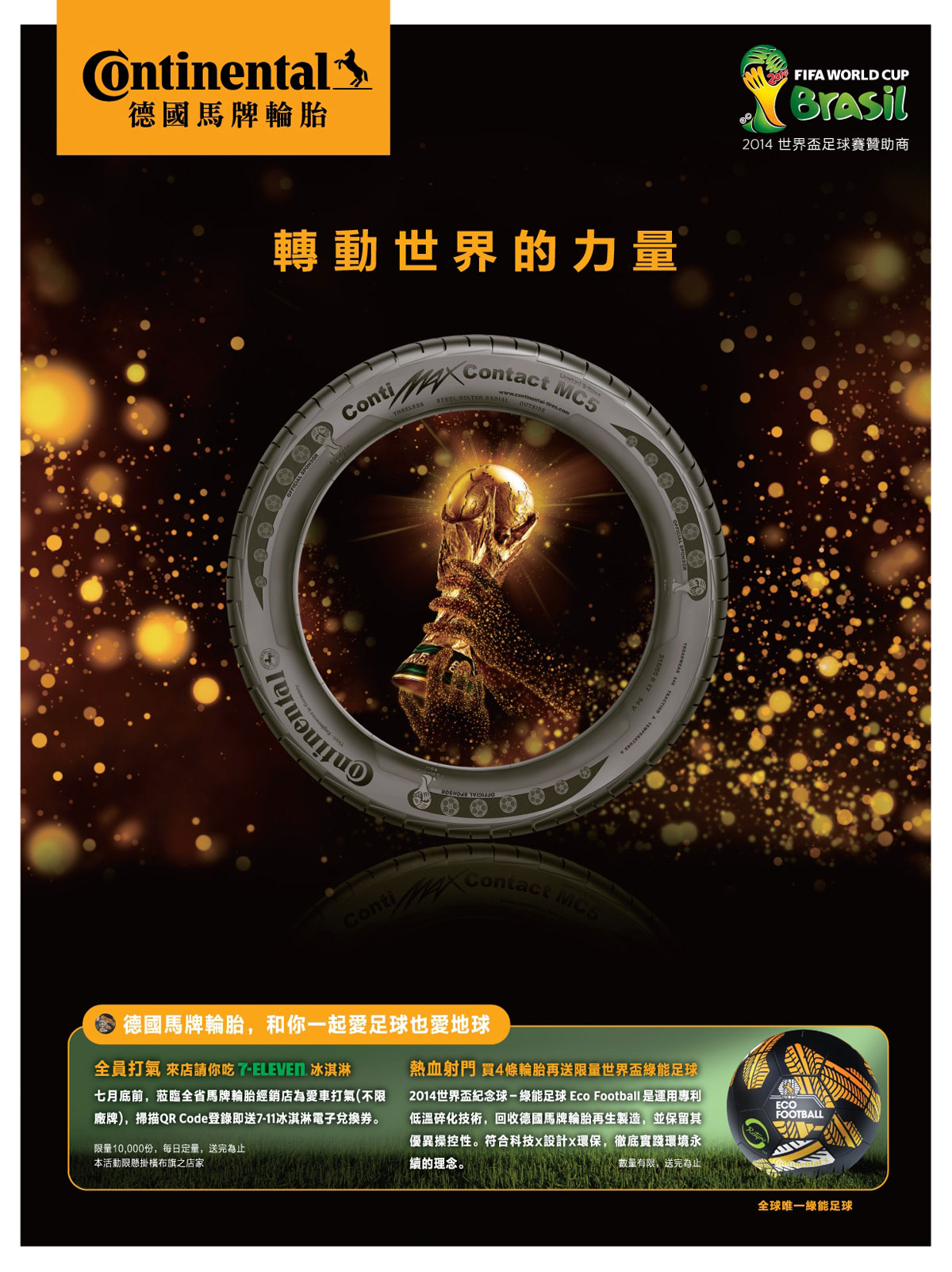 全球輪胎品牌領先業者德國馬牌輪胎(Continental)身為2014 巴西世足賽贊助商之一,於台灣推出世界第一顆回收馬牌輪胎再生製作的足球–綠能足球(Eco Football),以紀念世足賽,並實踐環境永續的理念。