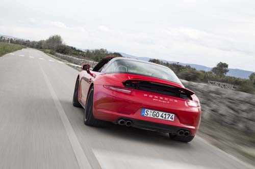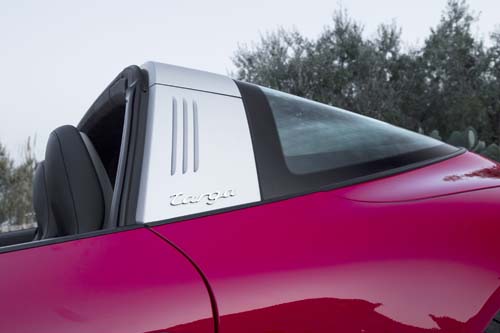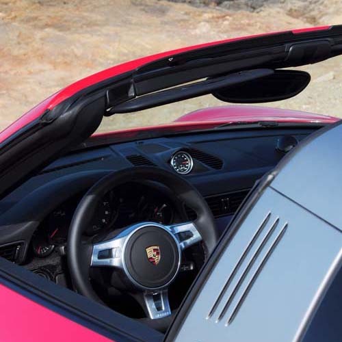 除了寬厚的B柱之外,911 Targa外觀上的另一個特徵則是全弧面構成的後擋風玻璃,它獨特的曲面設計,讓日本的汽車評論家將它暱稱為「金魚缸」,它的曲面與弧度與911車身後半段的鈑件線條搭配得天衣無縫,在車尾形成渾圓豐滿的視覺效果。在經典的寬厚防滾桿與曲面後擋的造型組合下,新車最重要的設計是全新開發的全電動Targa啟閉機構,原本老式的Targa車頂得手工拆卸,操作者除了得有點力氣之外,還得熟悉使用方式才能順利操作,但新款的全電動機構大幅簡化了開篷的過程,只要按下中央鞍座上的按鈕,車頂就會全電動啟閉。