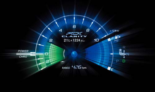 | 科技化的儀錶設計 FCX Clarity的儀錶板可以高科技來形容,在一個大圓形的畫面之中包含了充電、電力功率(10kW為一單位)、可行駛距離、檔位、加氫量與溫度等項目,配合漂亮的色溫也呈現藝術的氣息。 |