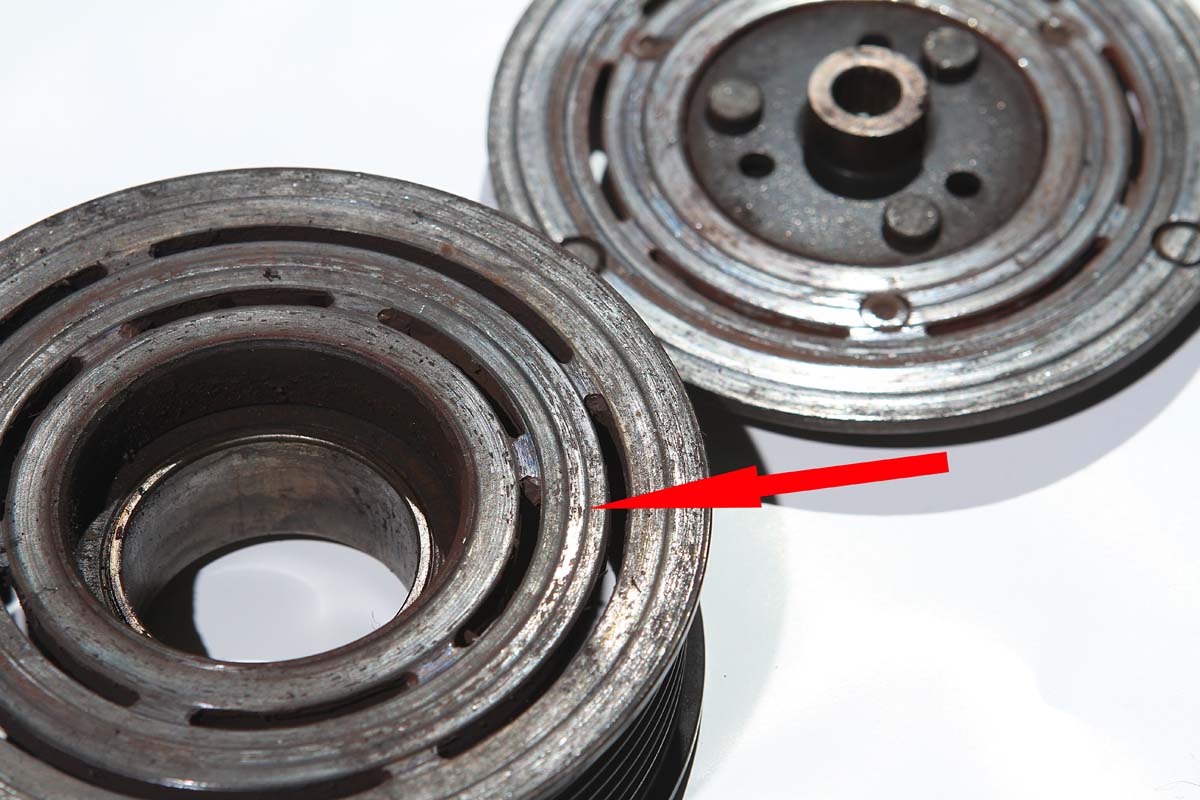 故障原因:壓縮機因潤滑不足重拖,使得電磁離合器打滑磨損。