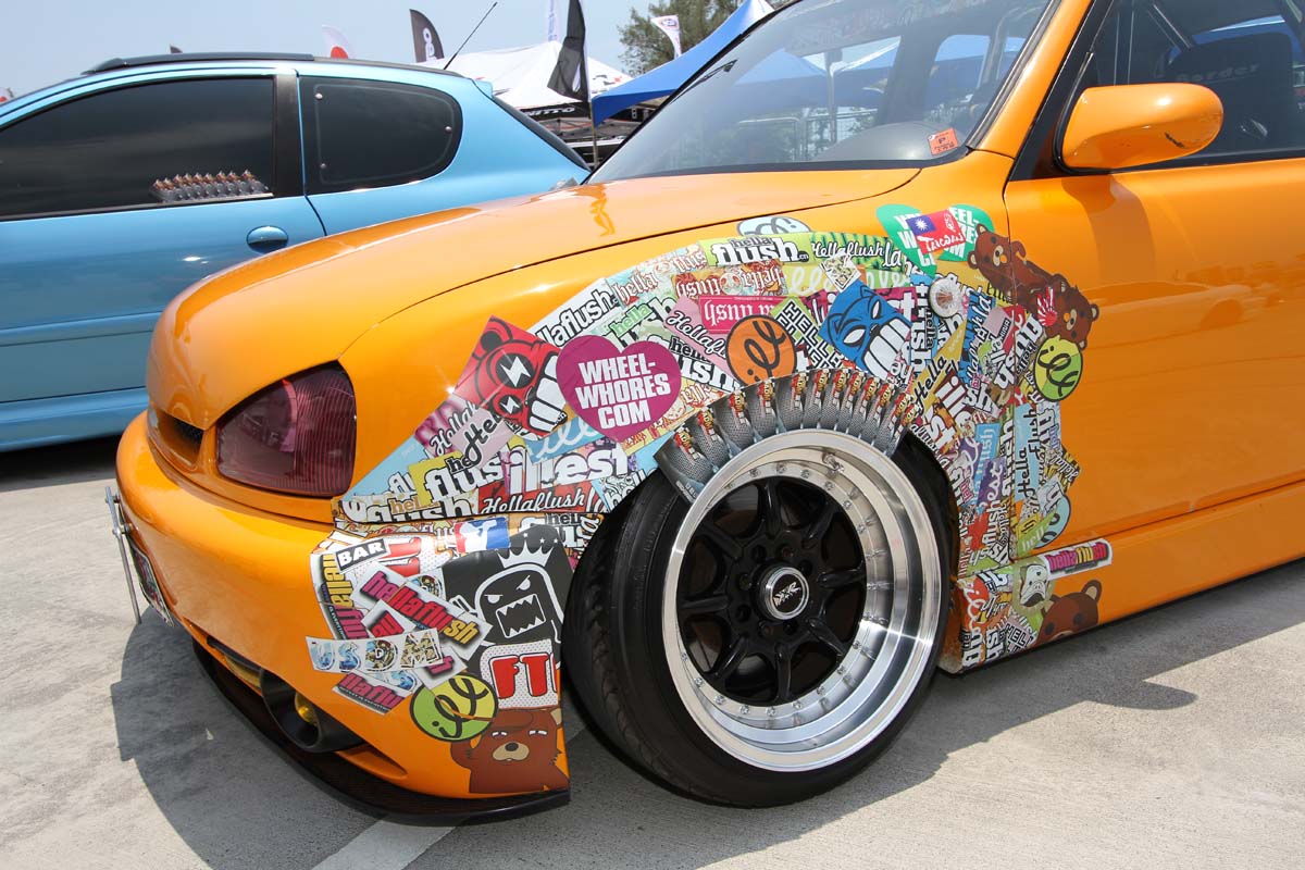 然而海拉風之所以在近幾年能夠竄紅的主因,除了在改裝視覺上的特殊效果,相較於其他風格改裝走的是性能派、奢華派或者美式派,Hella Flush並沒有在車型上做出任何限制,不分品牌或者車價,就算你是開十年以上的老車都能夠走海拉風。可以看到海拉風的Demo Car除了要具備乾淨的車身外觀,不少車主也會針對部分車身鈑件貼上五顏六色的爆炸貼紙加以點綴,而一組深唇式樣的鋁圈搭配大J數超寬設定,加上窄胎讓胎圈設定能夠呈現出極為誇張的內凹,為了讓胎圈外八的效果更為突出,透過外傾角調整器則有助於更大角度的調整。