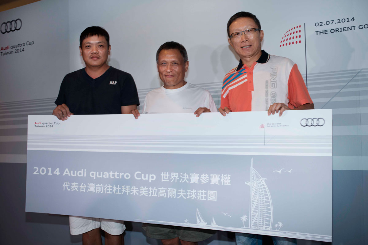 一年一度,廣受Audi車主喜愛的Audi quattro Cup車主盃高球賽已於7月2日圓滿落幕,在經過三場分區預賽,總計380位各路高球好手的激烈競爭較量之後,最後由北、中、南三區共12隊24人晉級台灣區決賽資格,各參賽隊伍於7月2日齊聚東方高爾夫球場參加「2014 Audi quattro Cup車主盃高爾夫球賽台灣決賽」,共同角逐最終前進世界決賽的資格。最後,由來自中區的陳丙材和張如柏在群雄中脫穎而出,將於12月7日至12月11日代表台灣,參加於阿拉伯聯合大公國第一大城—杜拜的朱美拉高球莊園(Dubai, United Arab Emirates Jumeirah Golf Estates)所舉行的2014年Audi quattro Cup World Final世界決賽,與來自全世界的頂尖高爾夫選手們同場較勁球技,爭取世界冠軍的最高殊榮!