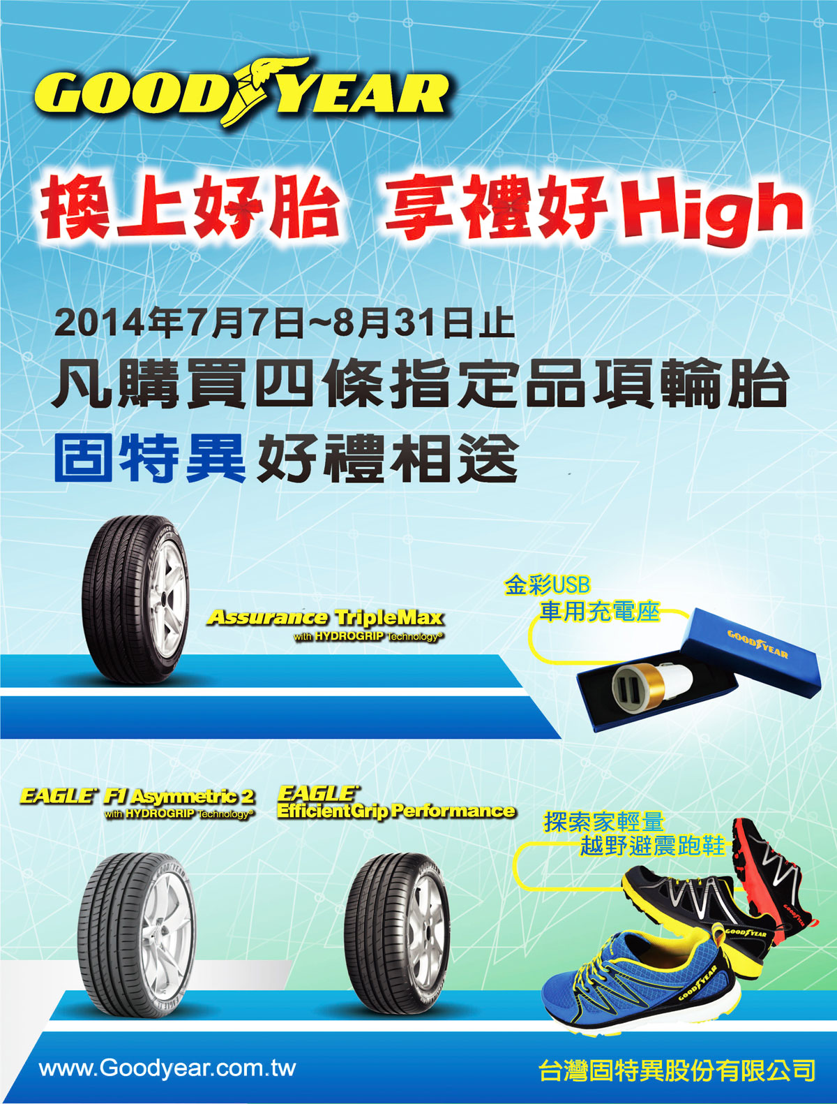 凡於活動期間,購買四條EAGLE F1 Asymmetric 2 或EAGLE EfficientGrip Performance 輪胎,即贈送固特異「探索家輕量越野避震跑鞋」免費兌換券乙張。購買四條Assurance TripleMax輪胎,即贈送固特異 「金彩車用USB充電器」乙個。最適合出遊的悠悠夏日,要玩得盡興又兼顧行車安全,就快至固特異全省經銷據點換上科技與安全都領先群輪的固特異輪胎!讓您真正換上好胎,享禮好High!