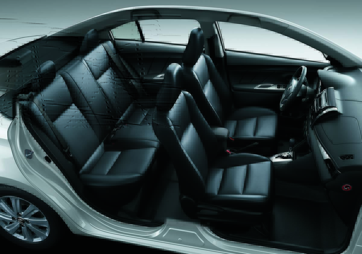 All New Vios在車身尺寸全面放大後,另一個優勢就是提供了更優渥的車內空間,軸距增加至接近中型房車水準的2550mm,加上座椅背薄型化設計,讓前後座乘員間距放大至912mm,比起前代車型增加了57mm,同時拜車寬增加10mm之賜,左右車室寬度放大至1310mm,並採用平整化底板設計,讓後座成員有更寬裕的腿部空間,以提供舒適的乘坐環境。All New Vios在置物機能方面也延續了一項良好的傳統,不僅有著476L的大行李廂容積,全車更有多達10處的貼心置物空間,可以放置許多小型物品,擁有極高的便利性。