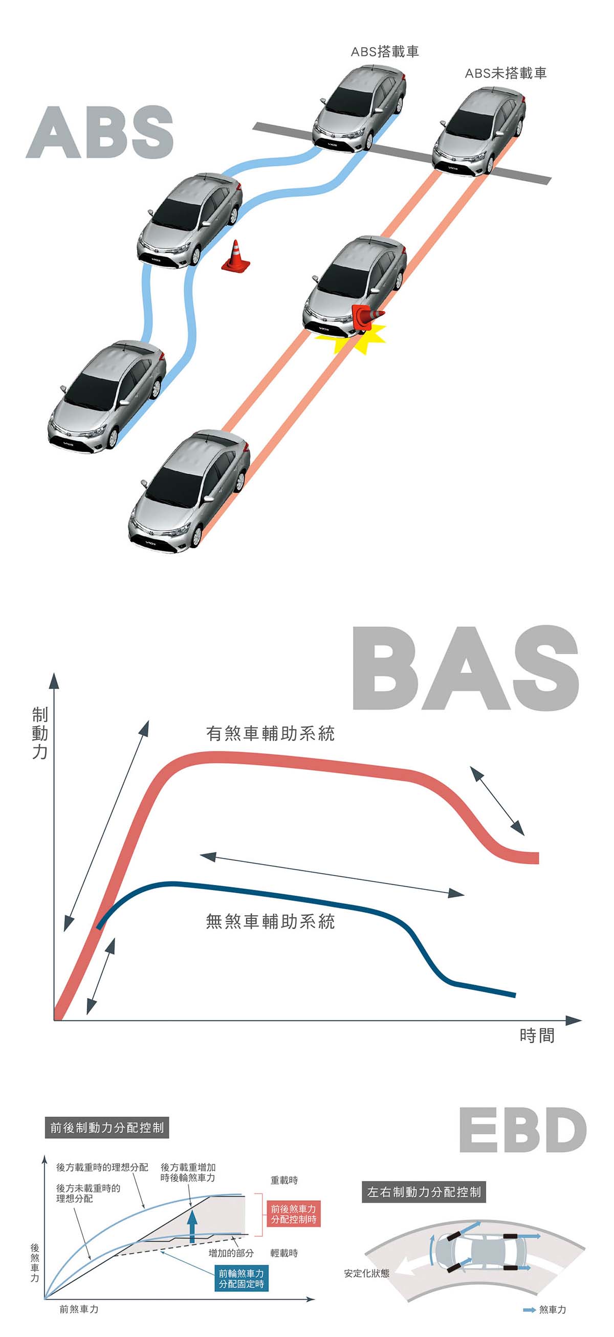 安全性部份,All New Vios同樣全面升級,採用GOA車體結構設計,大量採用高剛性材質,甚至在關鍵位置使用了潛艇級鋼材以及增加焊點來強化剛性,讓它有了強硬深厚的底子;主動安全上,配有ABS防鎖死/BAS煞車力輔助/EBD煞車力道分配輔助/BOS煞車優先等多合一煞車制動系統,提供足夠主動迴避危急的能量;被動安全方面,配置雙前座SRS氣囊、雙前座束力限制預縮式安全帶、頸椎傷害緩和前座椅,讓車輛發生碰撞時,能有效保護車內乘客的安全。