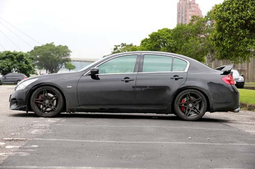 從這輛G37的外觀看來,車身降得超低,依照筆者的經驗,坐起來應該是跳跳車式樣!先試試低速,感覺真是令人驚喜,吸震性極佳、坐起來十分舒服,也不會胡亂跳,可是繞錐時卻沒有支撐力不足的現象,側傾的抑制十分稱職,據車主表示,目前軟硬設定為伸側22段(全部24段)、縮側4段(全部14段),改裝至今約8個月,平日代步、或是高速殺彎都有不錯的表現,而且270km/h殺彎也不會軟腳。