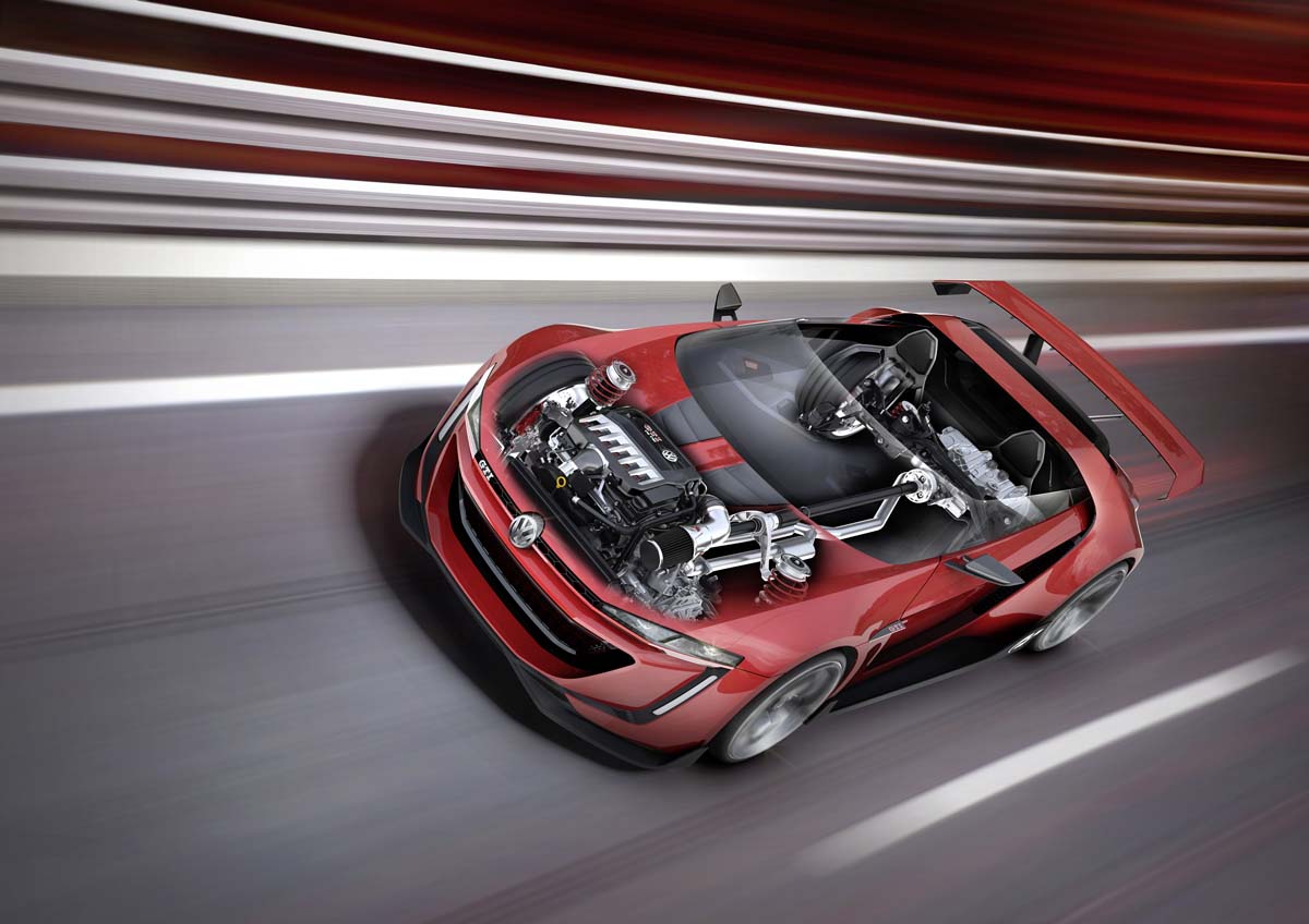 向來以生產一般房車、五門掀背車、旅行車著稱的VW,早在去年GT6宣佈問世前便偕同M.Benz、BMW、Audi等數十家品牌,宣告未來即將推出專屬的超跑概念車;在其他品牌陸續於官網上發表各自的「Vision Gran Turismo」特別版概念車後,藉著紀念Gran Turismo系列遊戲誕生15周年,VW也在5月底展示一系列GTI Roadster Vision Gran Turismo的假想圖,幾天後在Worthersee湖畔,實體車模型跟著問世。由VW設計師Malte Hammerbeck、Domen Rucigaj 以及Guillermo Mignot共同設計的GTI Roadster,在5月28日那天與Gran Turismo製作人山內一典和VW首席設計師Klaus Bischoff所評選出的優勝作品一同現身,車身線條部分延續先前Design Vision GTI的創作精神,比方說扁平的水箱罩、半罩式的頭燈、後輪拱前的超大導流氣孔,而為了傳達Vision Gran Turismo計畫所標榜的極致競速精神,車身多處採較為暴力誇張的視覺化造型處理,像引擎蓋上的進氣口和兩側折線、讓整體恫嚇力更為驚人的大包圍和輪拱暴龜,車尾配合充滿力量的車頭造型,也採用大面積的蜂巢式氣壩,然後再增加一具超大尾翼,讓原本就採雙人座敞篷設定的GTI Roadster顯得更具備頂級超跑的神格。