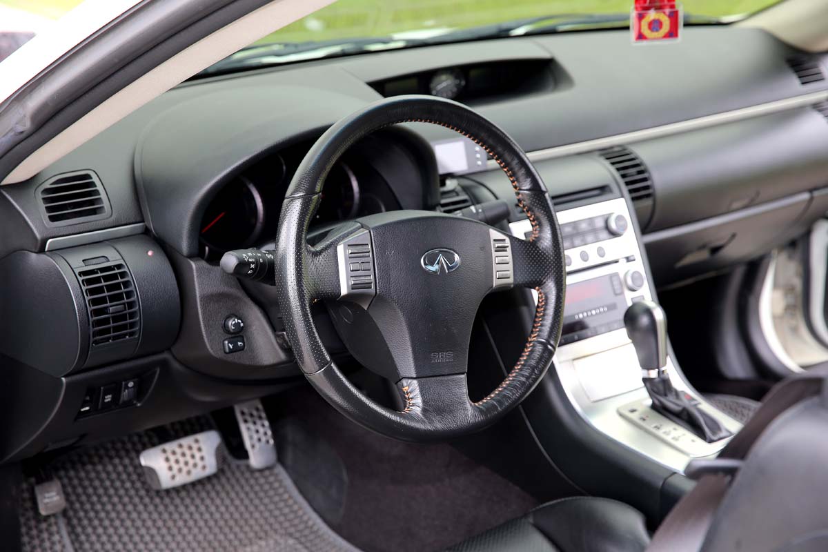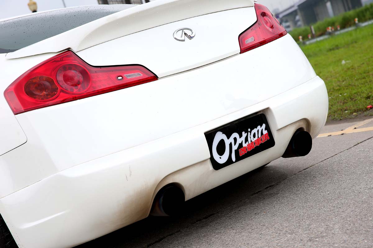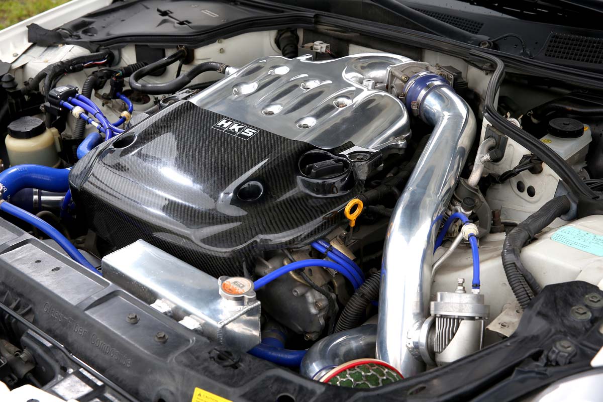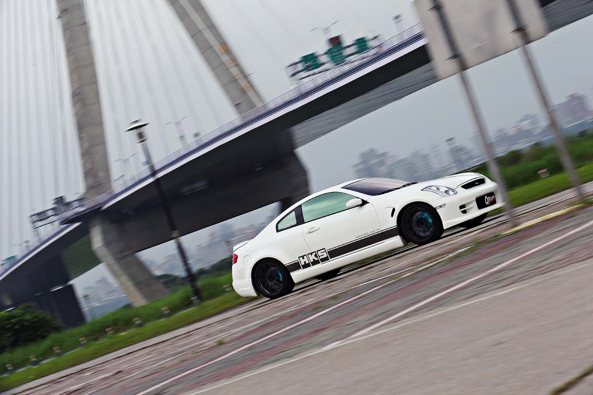 2003年登場的Infiniti G35,算是Nissan 350Z轎跑車版,擁有Coupe外型與轎式乘坐空間,其所搭載的VQ35DE引擎可榨出280hp/37.4kgm動力輸出,雖然動力調校比350Z略小,可是轎跑車外型反而是許多低調車主的選擇,搭配五速自排變速系統,提供輕鬆、亦可手動換檔的駕駛樂趣,而這輛由HKS台灣總代理昶和實業購入的Infiniti G35,改裝由HKS推出的GTSS Pro Kit雙渦輪增壓套件。這輛2005年的G35在購入時,在保留自排變速系統的條件下,先以外掛機械增壓的方式進行改裝,但HKS隨即推出命名為Pro Kit的雙渦輪增壓套件,身為總代理當然立即改為雙渦輪增壓設定。套件中包含HKS GTSS渦輪機、前置式Intercooler、鋁合金進氣管路、渦輪芭蕉、down pipe等,但是為符合改裝的自由度,此套件並不包含可程式電腦。
