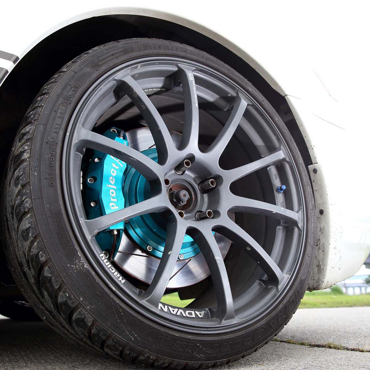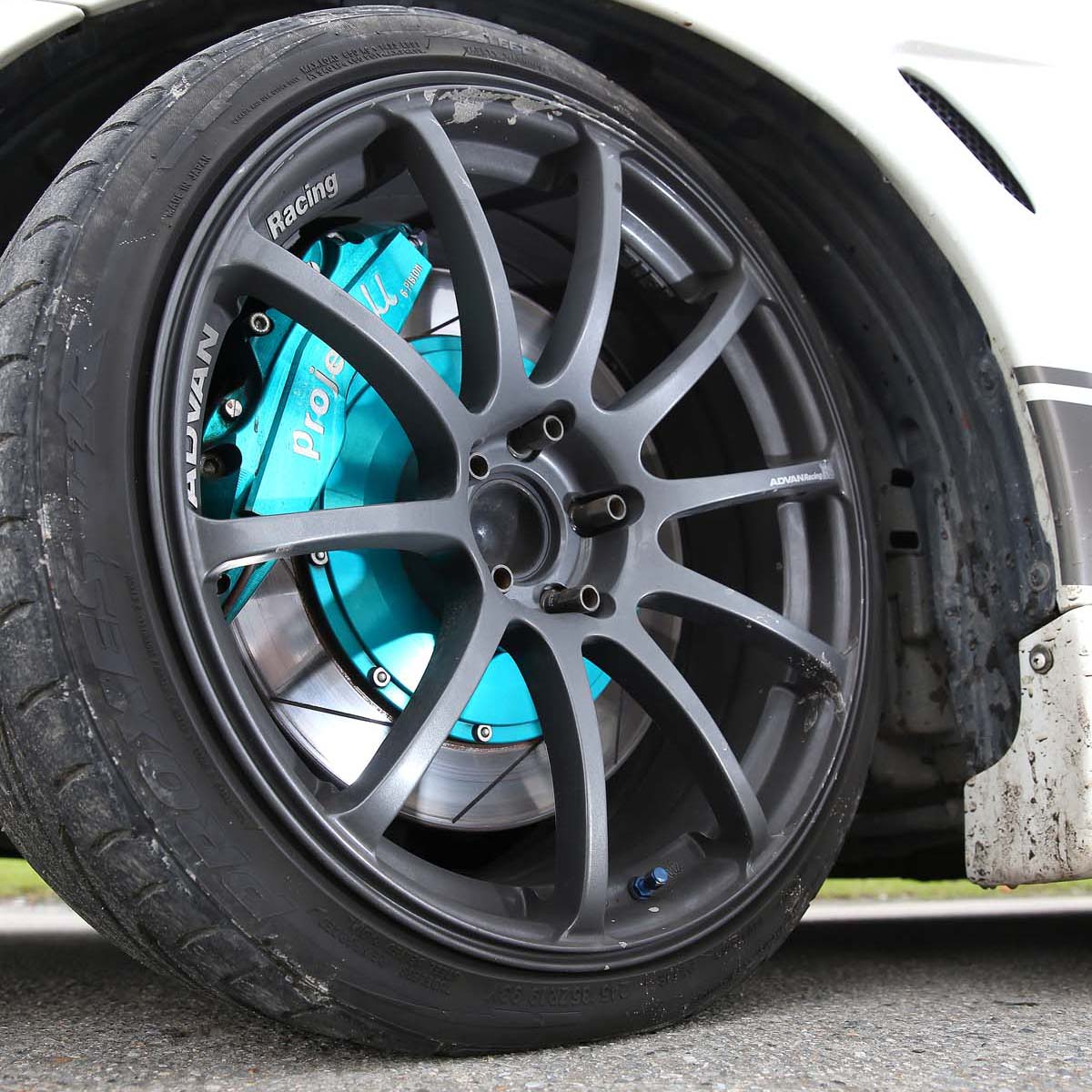 | 改裝Project MU前對六、後對四活塞煞車組,前370mm/後355mm碟盤尺寸將圈內塞滿,升級效果一拜,制動性能也大幅提升。 |