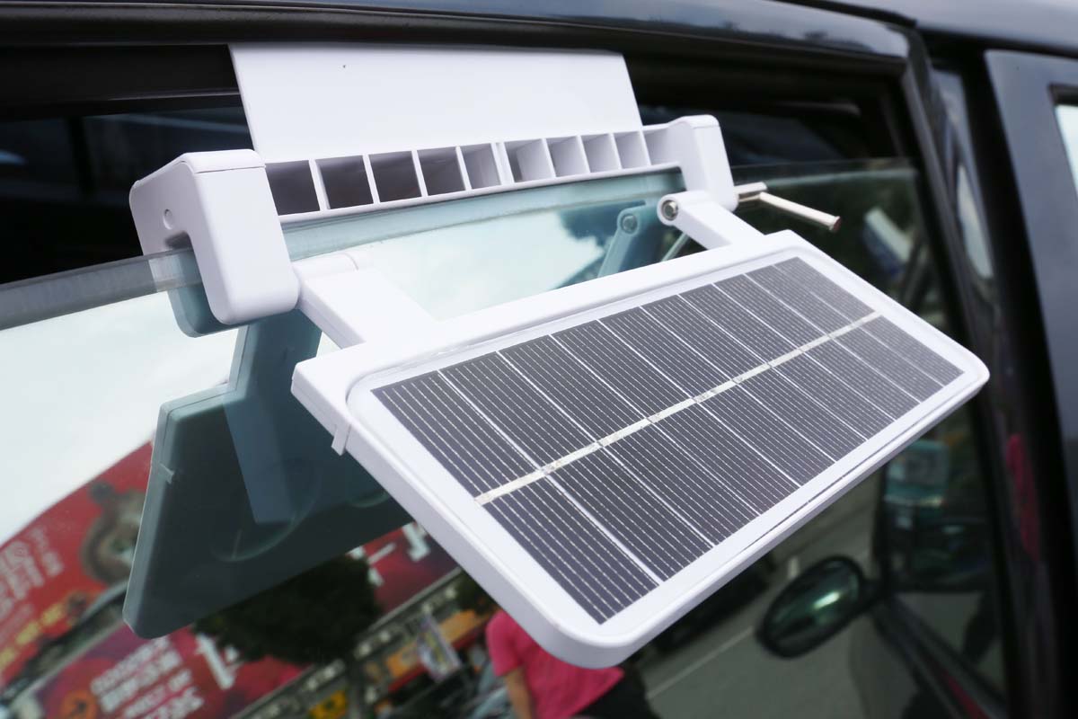 | 利用太陽能板來驅動風扇,進而將車室溫度導入車外。 |