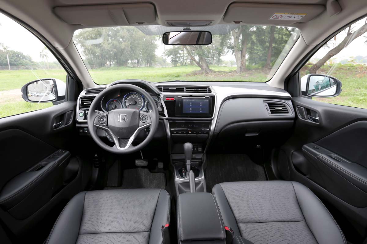 坐進City車室有著相當熟悉的氛圍,其鋪陳設計則與自家新Fit車型極為類似,內裝除用料質感不錯外,更導入了在此級距少見的高科技配備,在此部分展現出高度的誠意。配備上,除有7吋全彩觸控式螢幕及先端資訊整合系統外,另有獨特的觸控式恆溫空調、換檔撥片、定速、多功能方向盤以及後座冷氣出風口與雙前座氣囊等,相較於實用性取向的Vios則具有相當優勢,甚至有越級挑戰的實力。至於空間部分,City前座有著低重心與較包覆的乘坐感受,而後座頭部則因車型設計緣故稍顯壓迫,但以175cm成人乘坐,乘員膝蓋離前椅背仍有著約25cm的寬裕空間,搭配較為傾斜的椅背,則創造出較對手寬敞舒適的乘坐感受。