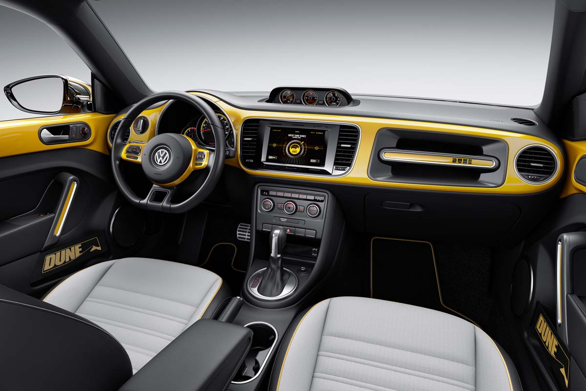 Beetle Dune Concept雖以現行Beetle為基礎,但於多處仍給予不同設計處理,其中下進氣壩輔以蜂巢式造型,並搭配金屬下護飾板,讓Beetle Dune多了一份粗曠,而車側、車尾皆同樣配置金屬下護飾板,更充滿了越野運動氣息。除了車身外觀極富動感外,為了符合其特性,與一般Beetle相較,Beetle Dune有著較寬的輪拱設計,因此車寬增加了48mm,底盤高度也提高50mm,搭配19吋輪圈後,則讓Beetle Dune有著一定的地形能力,但驅動系統仍為前驅設定,若改為四驅相信會有更加出色的越野表現。