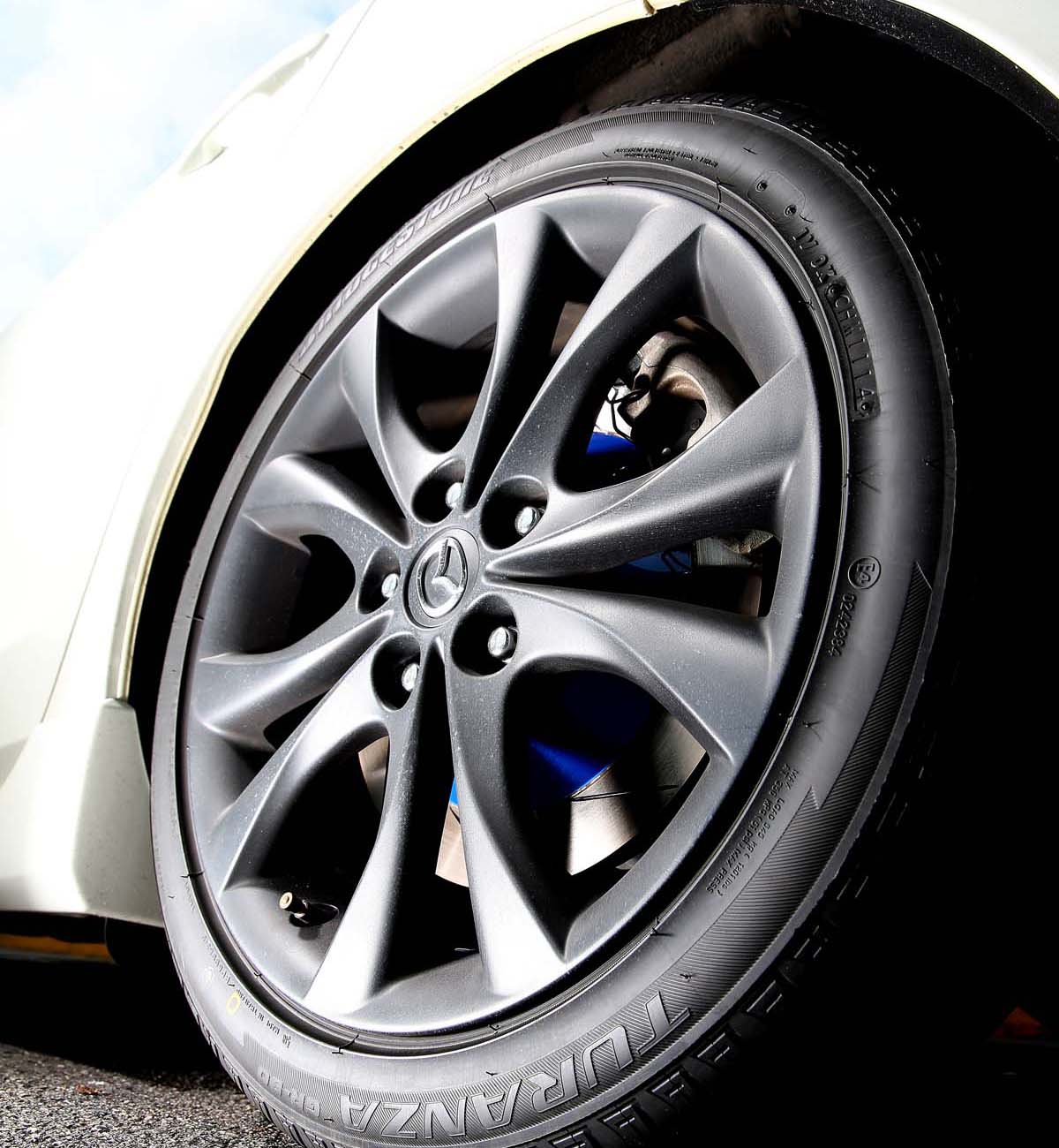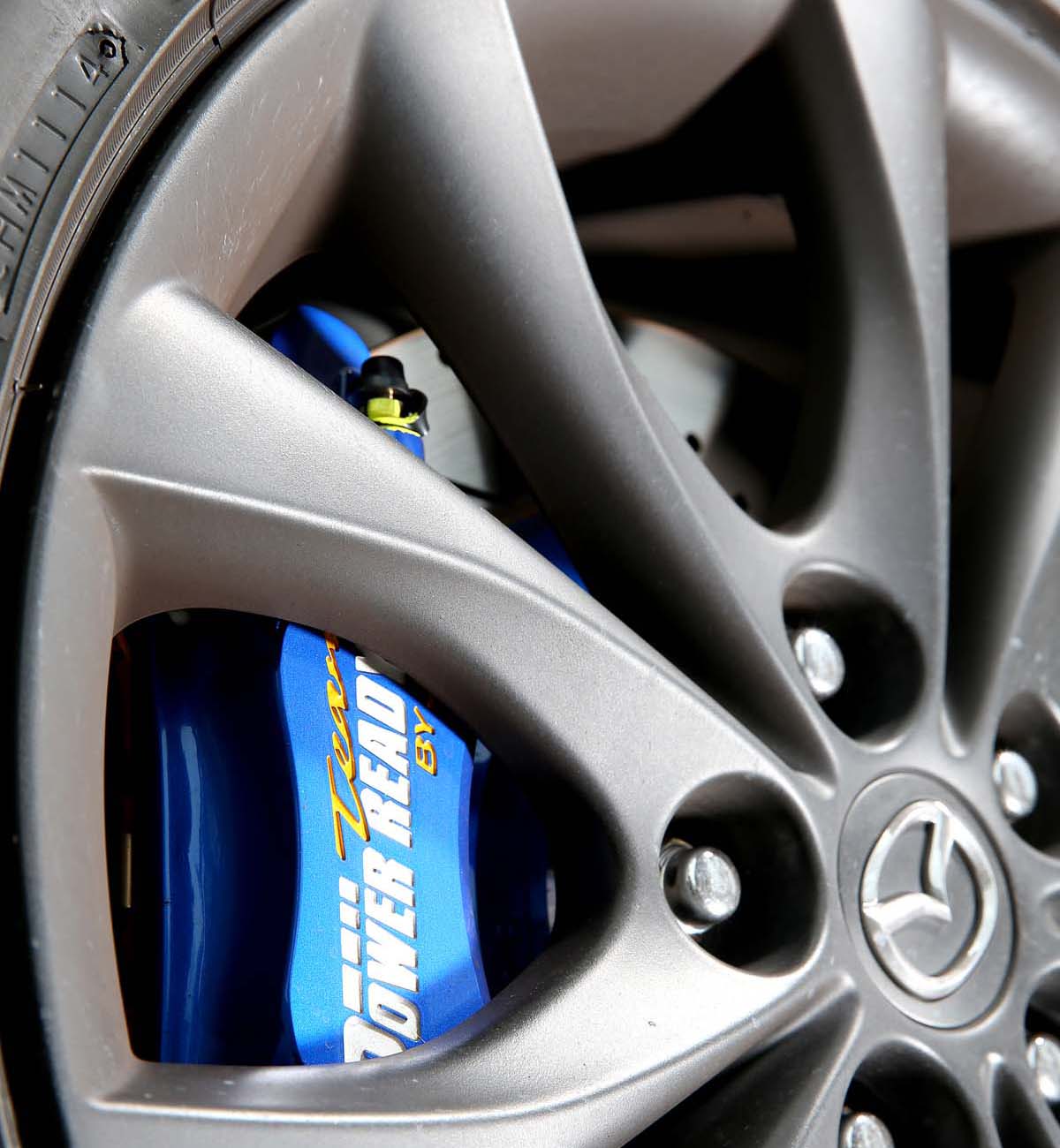 | 鋁圈流用2.5S原件並烤成消光黑,搭配Bridgestone GR90 215/45 R17輪胎使抓地性能提升,看來這是Mazda3最容易被接受的圈胎升級方式。 |