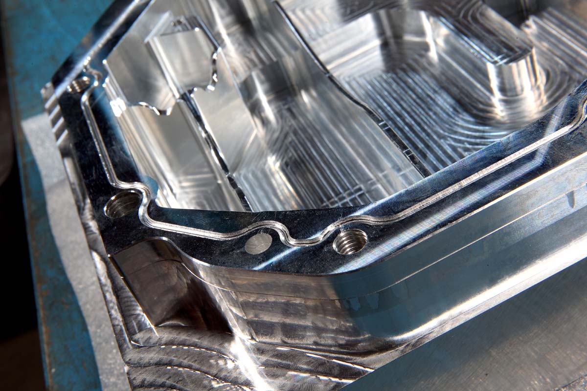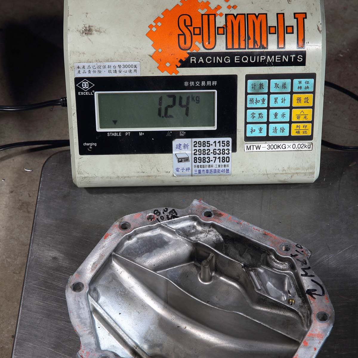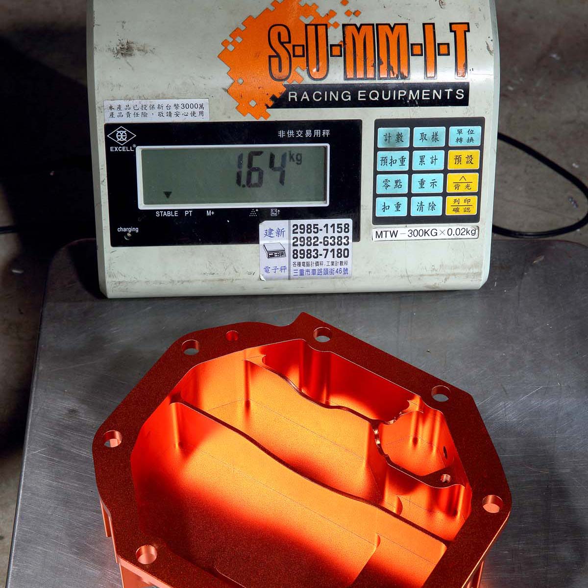 原廠的油底殼為鑄造鋁材,外觀簡單呈圓弧形,機油量為1200c.c.,為提升效能、Summit採用6061-T6整塊進口鋁錠製作散熱蓋,此材質熱傳導快,最重要的是容量也增大500c.c.(機油量為1700c.c.)、散熱面積增加60%,整塊鋁錠12kg,經CNC切工後剩下1.7kg(原廠約1.3kg),雖然重量比原廠略多一些,但是精密的設計與材質,不僅造型獨特,讓效能大大提升,使而達到更好的潤滑及散熱效果。