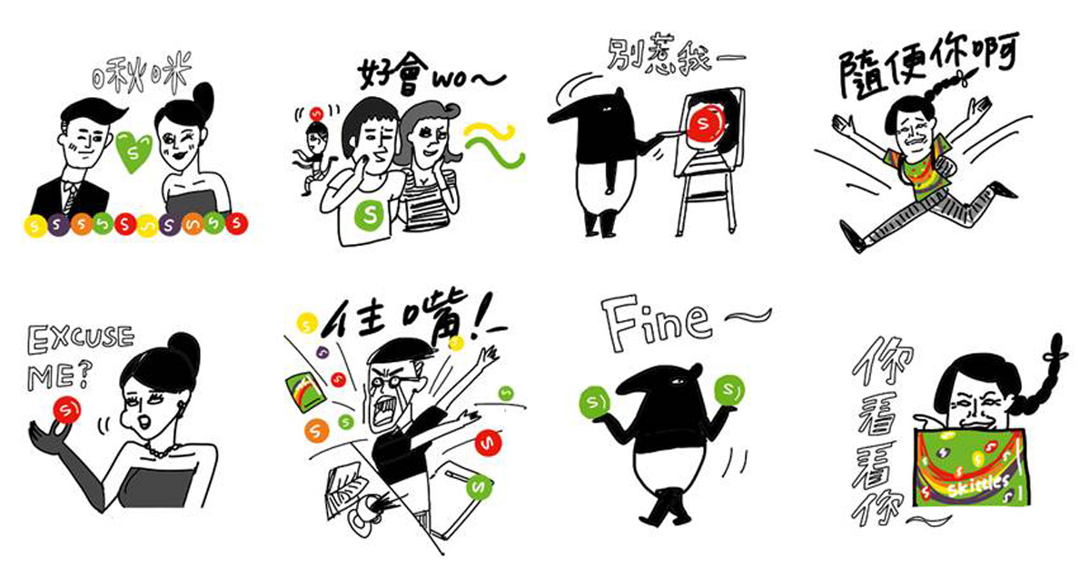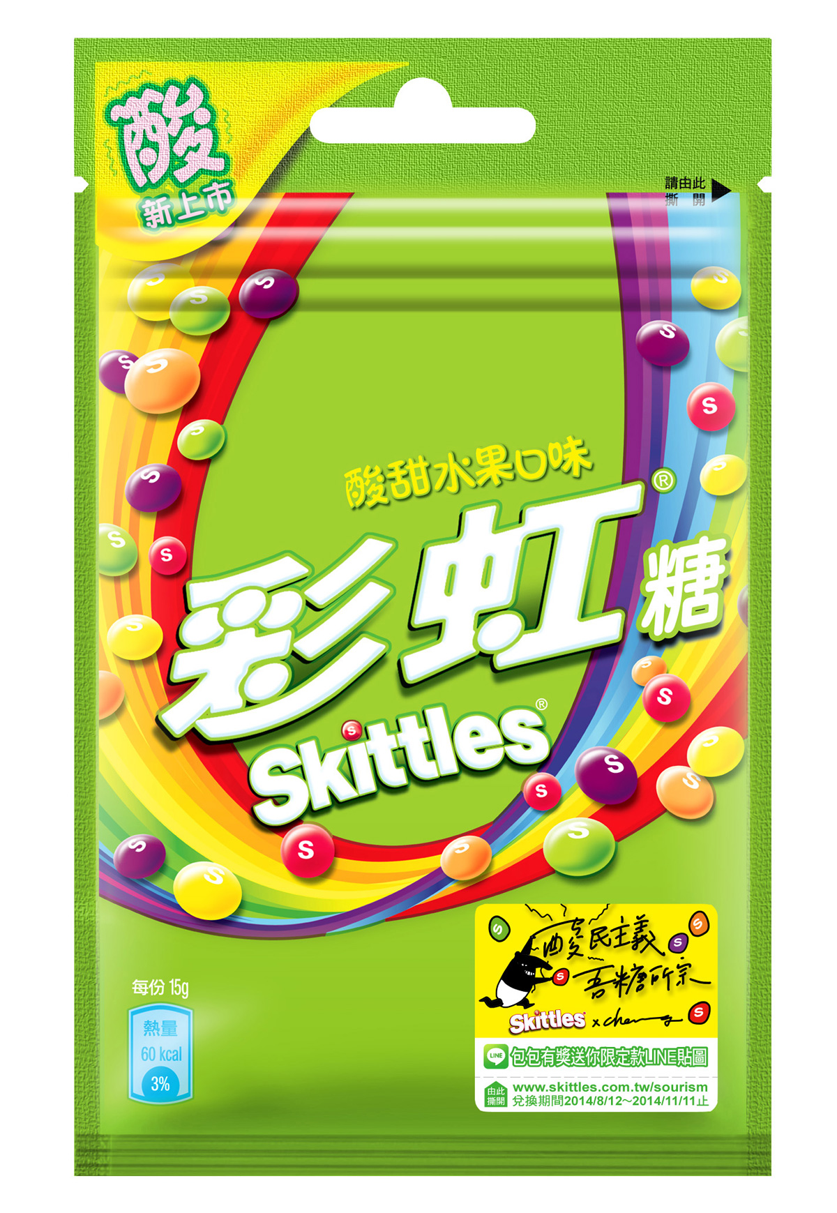 風靡一時的Skittles®彩虹糖「酸甜水果口味」再次上市,全新配方讓你愈吃愈酸,愈吃愈順口,夾鏈袋包裝更讓你分享自用兩相宜!同時自2014年8月12日起至11月11日止,Skittles®彩虹糖和人氣插畫家Cherng馬來貘攜手合作推出限定款「酸民主義,吾糖所宗」LINE貼圖,黑白Cherng馬來貘首次在插畫中融入彩色元素,只要輸入Skittles®彩虹糖包裝上活動貼紙的序號,即可下載,體驗酸到骨子裡的「酸民」貼圖!