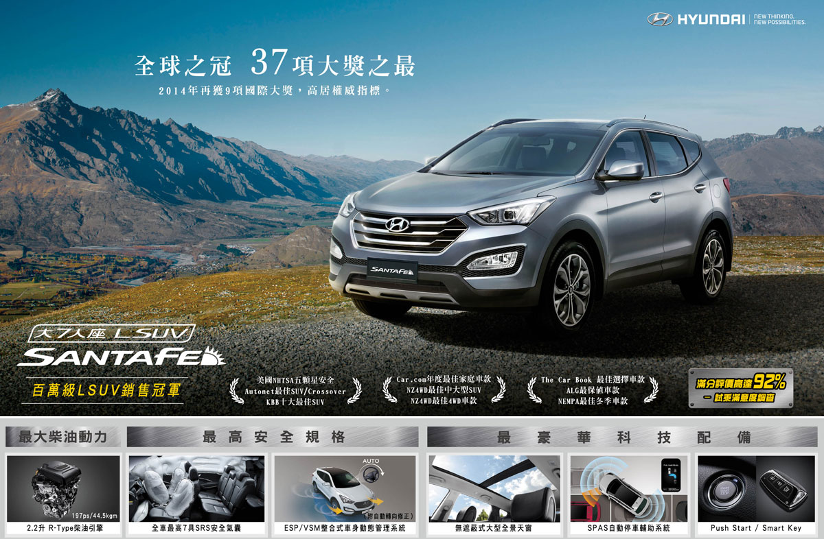 而全新上市的大七人座LSUV All New Santa Fe也在本月份持續釋出購車即贈送2萬元配件禮的促銷;HYUNDAI All New Santa Fe 自今年第二季在台國產上市後,即獲得廣大消費者的喜愛,車主試乘滿意度更高達92%以上, Santa Fe以其全新的設計及優勢的品質與產品力,於2014年國際車壇再度獲得9項國際大獎的肯定,共計累積全球37項大獎榮耀,也更奠定其LSUV不可撼動的地位。
