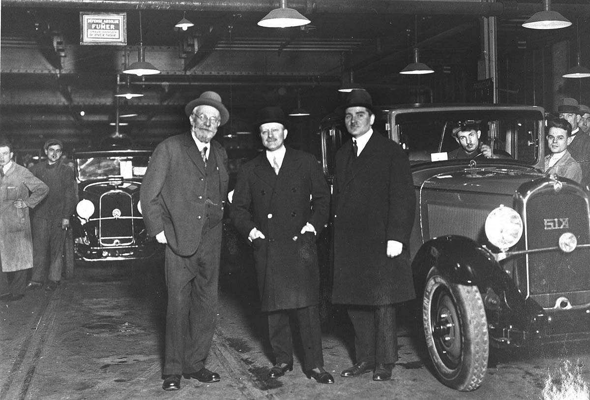 | Andre Citroen與工程師Louis Dufresne和Jules Salomon在工廠內的合影。 |