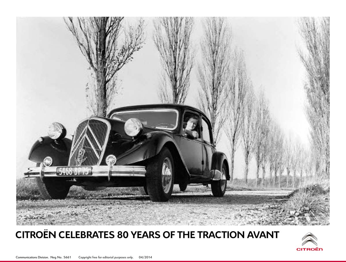 | Citroen第一部劃時代車款Traction Avant於1934年誕生,它擁有三項革新設計:焊接式單一車體、前輪獨 立懸吊,以及前輪驅動系統。 |