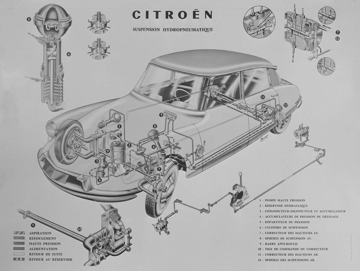 Citroen於戰後展 開的汽車革命,在1955年登場的DS身上獲得完全體現。它首度搭載了Citroen傳奇的液壓氣動自動升降懸吊系統(曾搭載 於後期的Traction後懸吊進行試用),同時也是歐洲第一部使用碟式煞車的量產車。DS除了配備動力方向盤、動力煞車 和動力懸吊之外,更於1968年開始採用主動轉向式頭燈。此外,它還搭載了不需離合器即可換檔的半自動變速器,其高 液壓系統成為日後許多Citroen車款的基礎設計。包括SM、GS、CX、BX、XM、Xantia、C5和C6等車都有一個共同特徵,那 就是當引擎啟動時,車身的離地高度會自動升起,《Car & Driver》稱其為「機械駱駝」。此懸吊系統的高度調整 能力可使車輛避開障礙、輕度溯溪並便於換胎,無須乘客費力即可輕鬆克服崎嶇路面。事實上,Citroen這套劃時代的高 液壓系統也曾在該廠與Maserati合作的時代,為後者的產品做出許多貢獻。包括動力離合器操作系統(Bora)、動力踏 板調整(Bora)、啟閉式頭燈(Bora、Merak)、煞車(Bora、Merak、Khamsin)及動力方向盤(Khamsin)等,另外 Quattroporte II整部原型車亦是等同Citroen SM的Maserati四門版本。從車身設計角度來看,Citroen亦是先驅之一, 早在50年代即運用風洞測試的該廠,旗下的DS、CX可說是空力設計的領先典範。在這些樂觀成就背後,卻是一波接一波 的股權轉移紛擾。