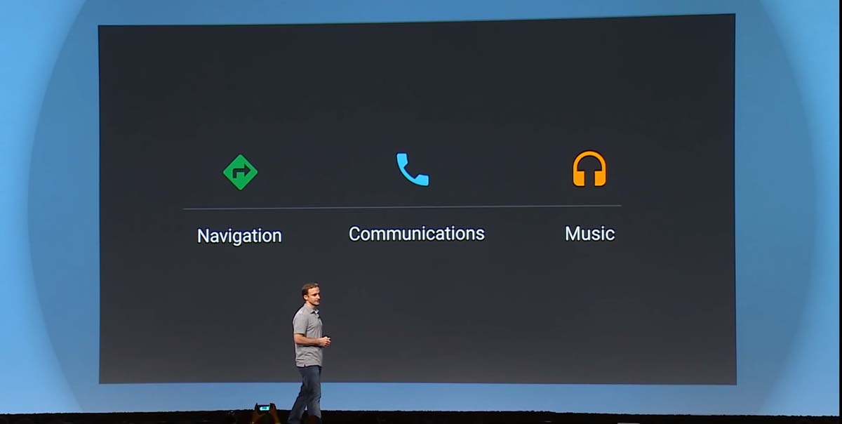 | Google I/O大會上透過駕駛艙來示範Android Auto,主要功能有導航、通訊跟音樂,說穿了就是手持裝置的延伸,而這些應用程式除了可觸控外,也都可以利用語音執行。 |