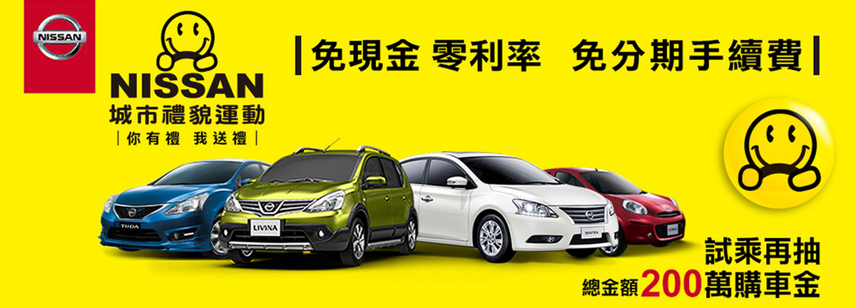為呼應城市禮貌運動,NISSAN即日起推出「你有禮我送禮」活動,即日起至10月31日止,消費者凡刷卡購車,即可享有業界首創「免現金、零利率、零手續費」超值優惠,最高可刷20萬元,並搭配高額分期零利率專案,玉山卡再享12期分期零利率、零分期手續費優惠,NISSAN國產全車系加碼再贈送六大系統八年無限里程延長保固,四門大TIIDA 1.6L及NEW MARCH車系除享以上優惠外,更免費升級LDWS車道偏移警示系統與SMART HUD行車安全顯示系統。進口車部分, ROGUE、MURANO及JUKE TURBO版,除同享「你有禮我送禮」活動優惠外,更贈送總價值超過10萬元的六年失竊保障大禮。