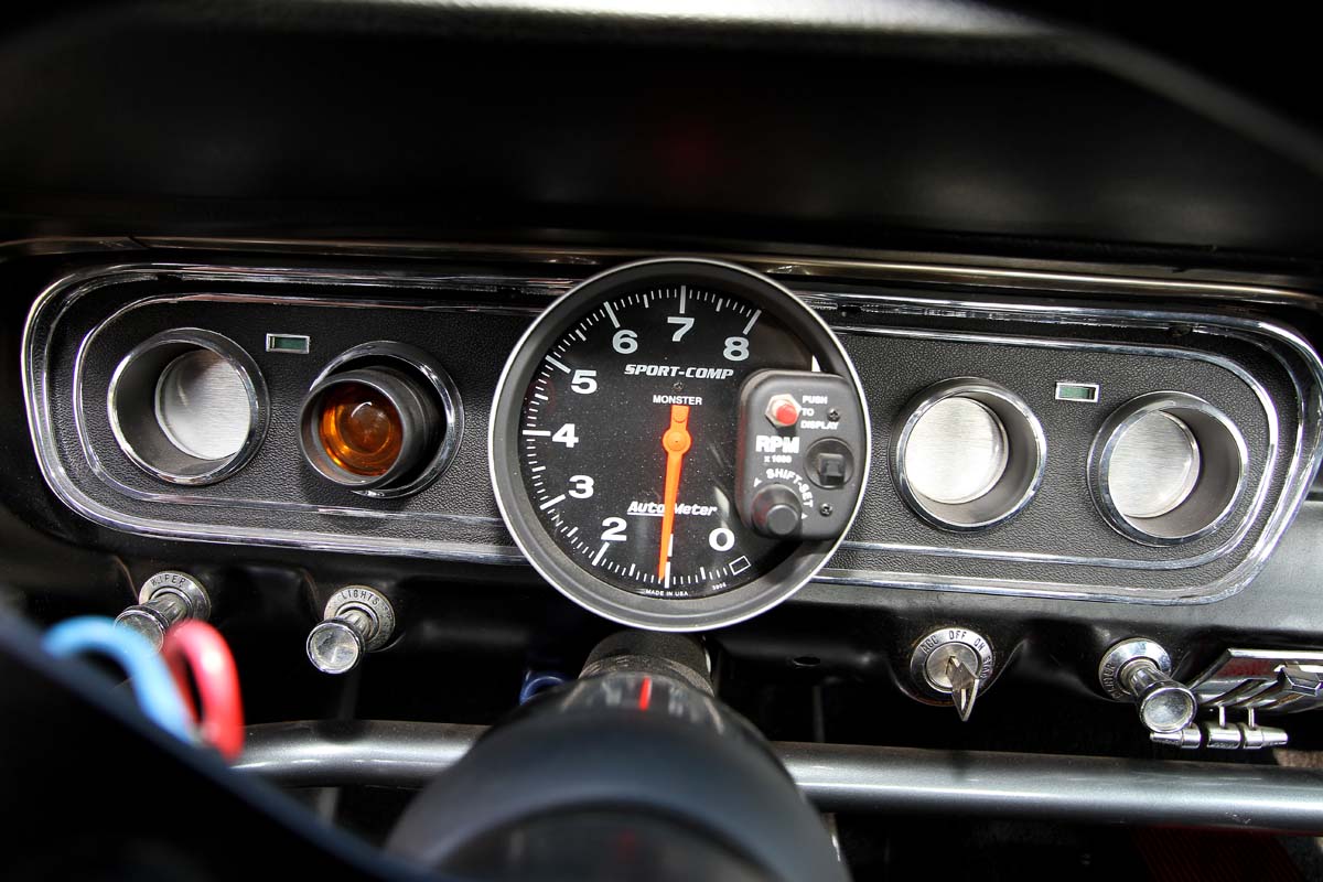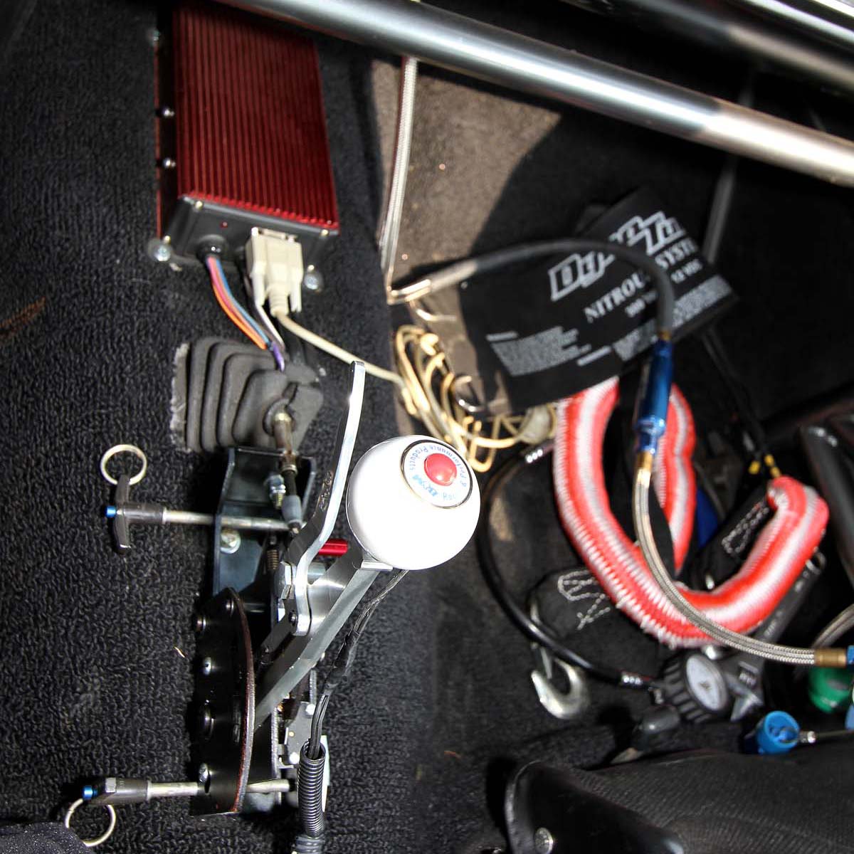 | 美式車輛的機械感向來都是車迷津津樂道的地方。排檔桿上方的紅色按鈕為零四彈射時所使用的起跑按鈕,壓下後即可鎖定輪胎動力,壓下前方金屬拉桿後車輛隨即射出。 |