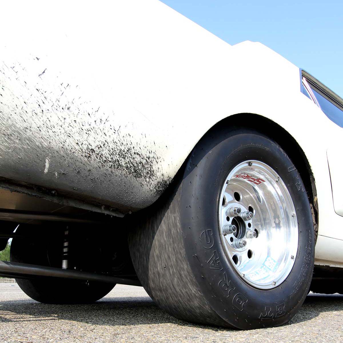 | Drag Racing專用的胖胖胎就是為了提供車輛瞬間加速時的抓地力,因此胎壓的設定都會偏低,利用輪胎的變形率達到更大的接地面積,不過這個部分原先就是設定在專用賽道上使用,因此一般道路上還是無法提供穩定的推進力。 |