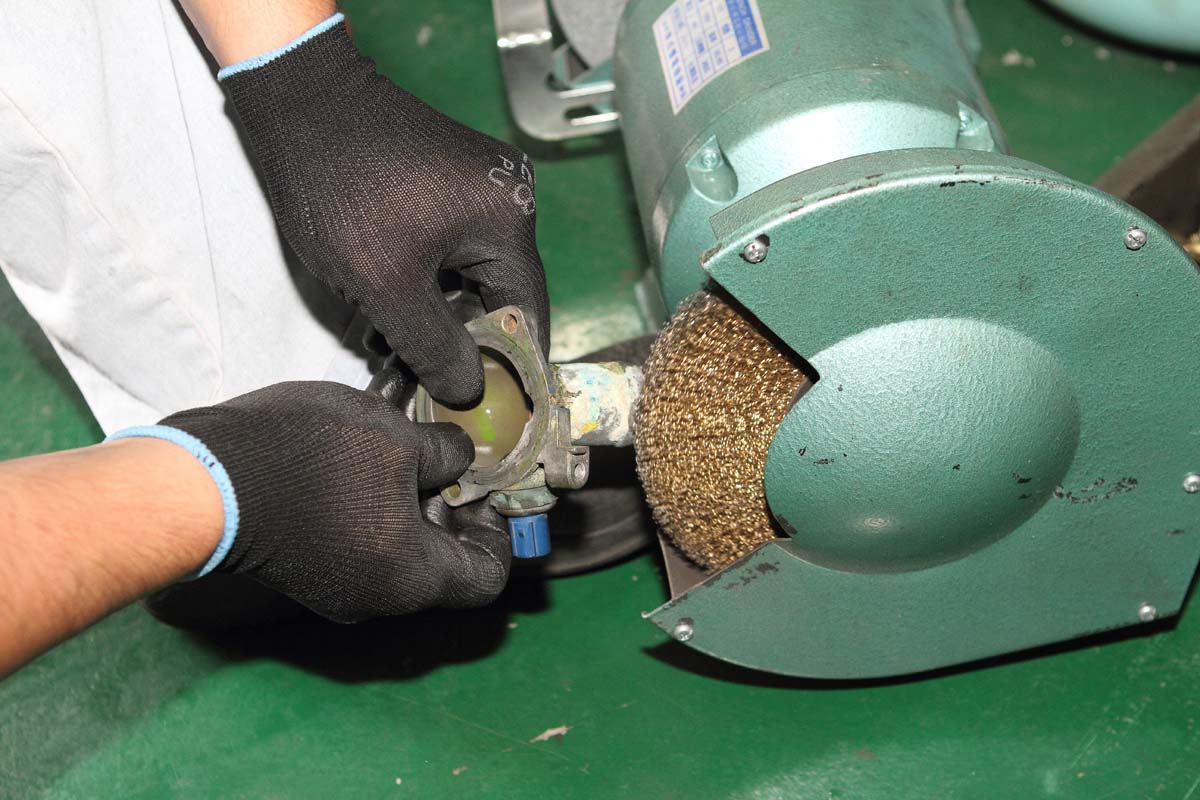 經過砂輪機的拋光,鐵水管的表面恢復原本的平整狀態,這樣矽膠強化水管套上後,鐵束環才能束緊而不漏水。
