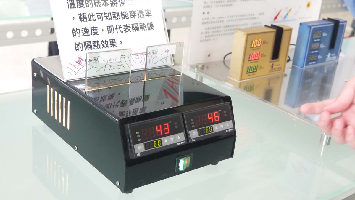 | 拿SMART智能膜和V牌進行熱穿透測試,可看到儀器上V牌在隔熱表現顯然比不上SMART智能膜。 |