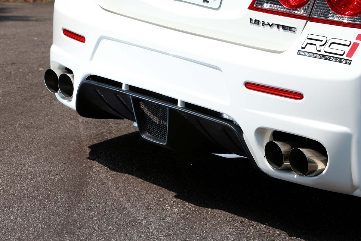 在外觀上,車頭的改裝幅度算是此套件的最具特色的部分,此次RCI特別大膽地融合了Hond CR-Z的車頭設計元素在其中,卻又巧妙的與Civic 8形成一個完美的比例,同時前保桿搭配極具張力的下擾流一氣呵成,與車身側裙的設計達成整體性的搭配,讓車頭呈現出不同以往的肅殺之氣,值得一提的是,在引擎蓋與前保桿的搭配之下,線條與原廠的有著完全不同原廠較為平庸的呈現,在RCI的操刀之下,Civic 8已有了全新的面貌單生在我們的眼前。車尾的部份,RCI將後下擾流與中央分流作延伸,並且搭配錚鋒四出尾管呈現出車尾的霸氣,尾翼與後保桿整體的平衡性相當不錯,不顯浮誇但卻讓人想仔細端詳。對空力套件熱愛的讀者一定相當了解,裝上空力套件後雖然外觀上是眾所矚目的焦點,但是每每開往地下室或是高低起伏有落差的路面時,就是下巴受傷的時候了,Civic 8 GT所使用COOL MAX高低可調避震器降至約一指幅的高度,不會發生撞擊地面的窘境,可見設計者之用心程度。