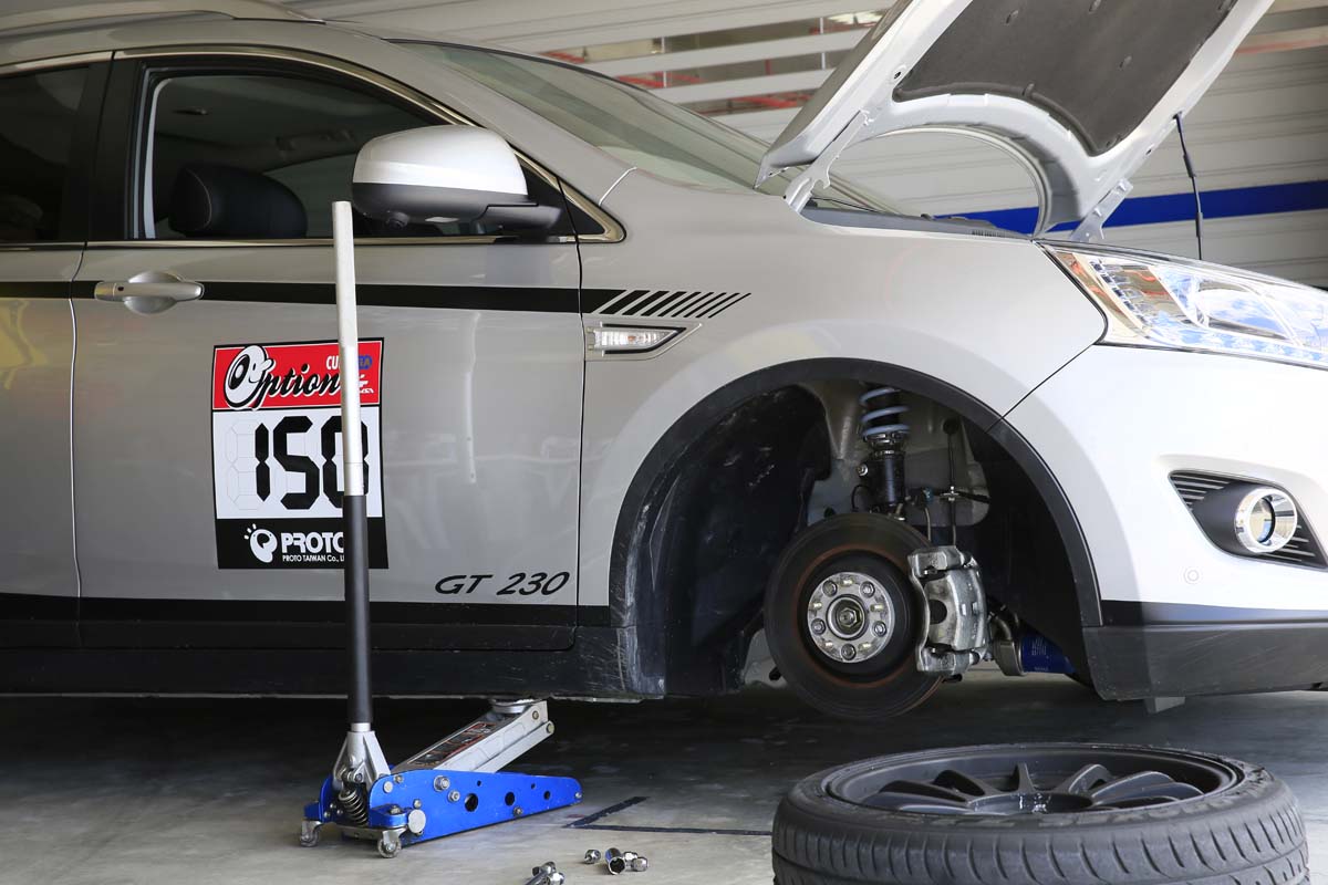 | XPro2 U6 GT230量產試裝車煞車系統沿用LUXGEN SUV/MPV卡鉗與前/後350/330mm加大碟盤,同時可見懸吊改裝使用GEARS RACING道路版Hi-low Kit套件,可兼顧道路舒適性與賽道要求的操控性。 |
