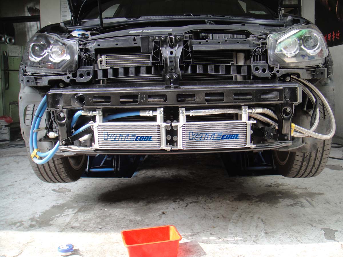 機油冷卻器的功能,顧名思義就是降低機油的工作溫度,為何要控制機油的溫度呢?重點就在於延長機油壽命,並確保油膜於引擎重負荷時,不會因高溫而降低其保護性。許多較為舒適化的房車上並未加裝機油冷卻器,就連競技風格強烈的引擎,多數也僅以位於機油芯固定座的圓型水冷系統,來冷卻機油溫度,因此對於喜愛高轉速域奔馳的車主,或機油同時要負責冷卻高熱渦輪軸心的渦輪車來說,機油冷卻器是無法省略的改裝套件。