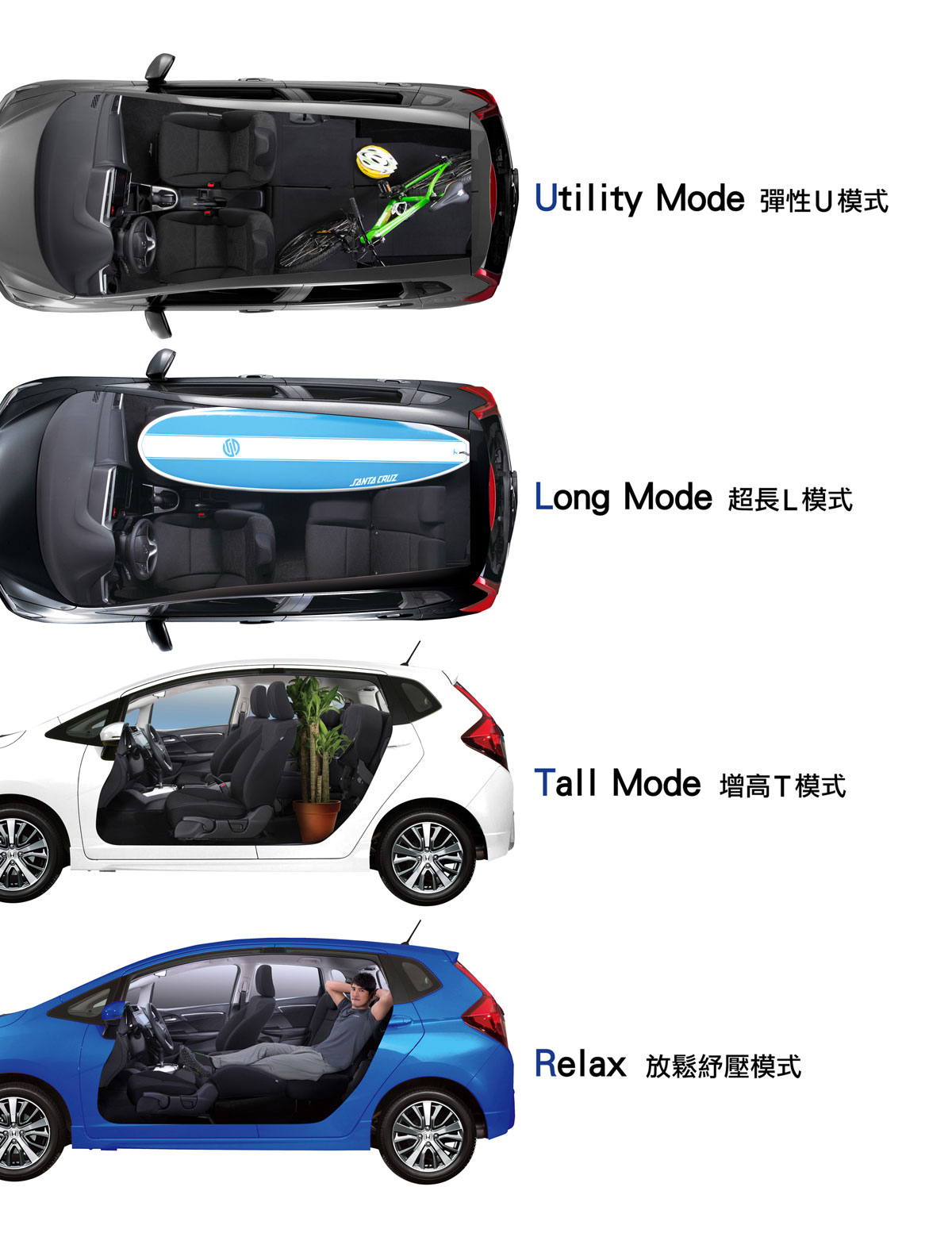 在車室空間設計上,延續獨創中置油箱設計,以進化版的「車室空間極大化,機械空間極小化」MM思想,維持方便駕馭的靈活尺寸,實現超越想像的寬敞與舒適。後座與前座距離較前代再擴大80mm、軸距加長30mm、全長加長55mm,縮短後懸且讓後座輪弧極小化;在擴大前後座距離後,All New FIT創造出超越同級車的空間及舒適性,除提供壓倒性的車寬、車高、肩部空間外,並擁有同級車最大的363L行李箱空間。而FIT獨有、變化多端的ULTRA多功能座椅,提供多樣的座椅模式變化,讓車室容量及便利性更為提昇。