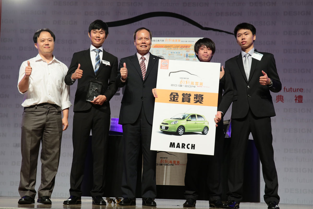 全臺灣最具規模的汽車設計賽事「2013-2014裕隆日產汽車創新風雲賞」今(10/1)日舉行決選暨頒獎典禮,本屆活動共有上百組優秀隊伍報名參賽,經過激烈的競爭角逐,最終由國立臺灣師範大學所組成的「磁激電叱」隊脫穎而出,其作品「Nissan Smart Leaf」充分展現競賽題目「NISSAN科技心生活」創新精神,勇奪「2013-2014裕隆日產汽車創新風雲賞」金賞大獎全新NISSAN NEW MARCH汽車一台,現場來自全國各校超過300人加油團為得獎團隊高聲喝采。