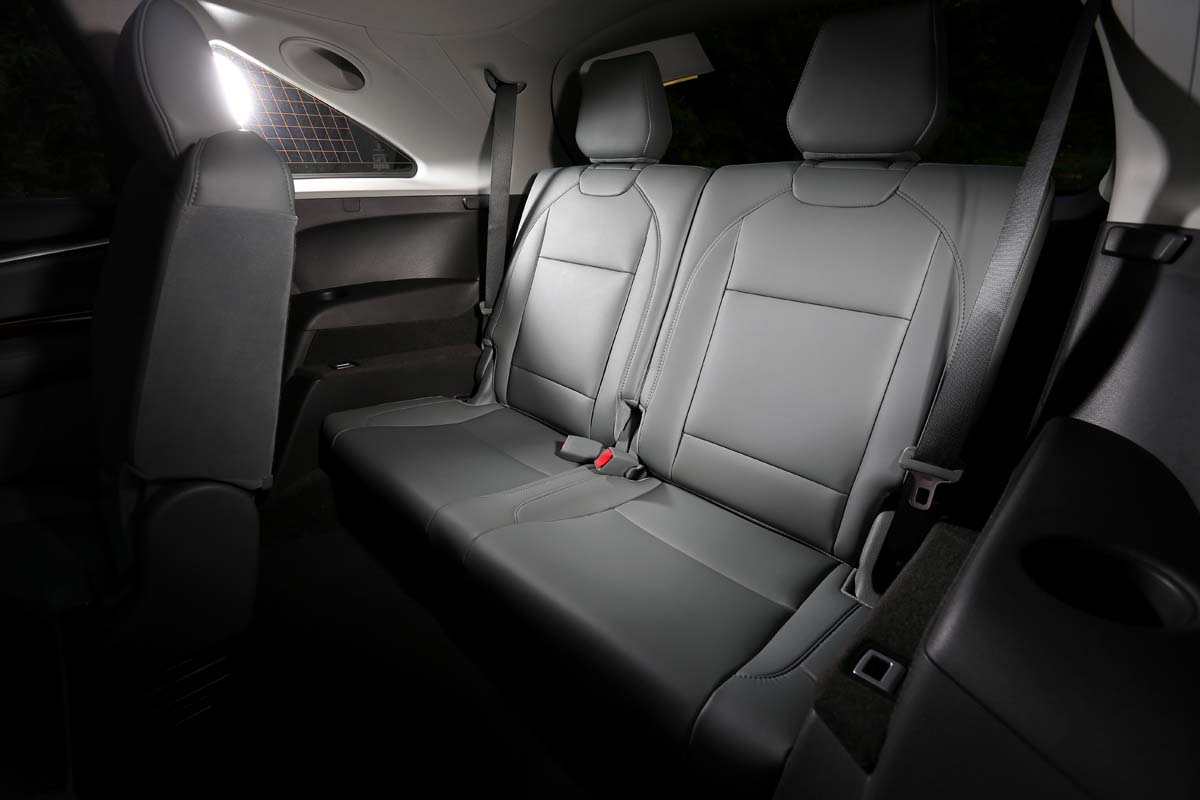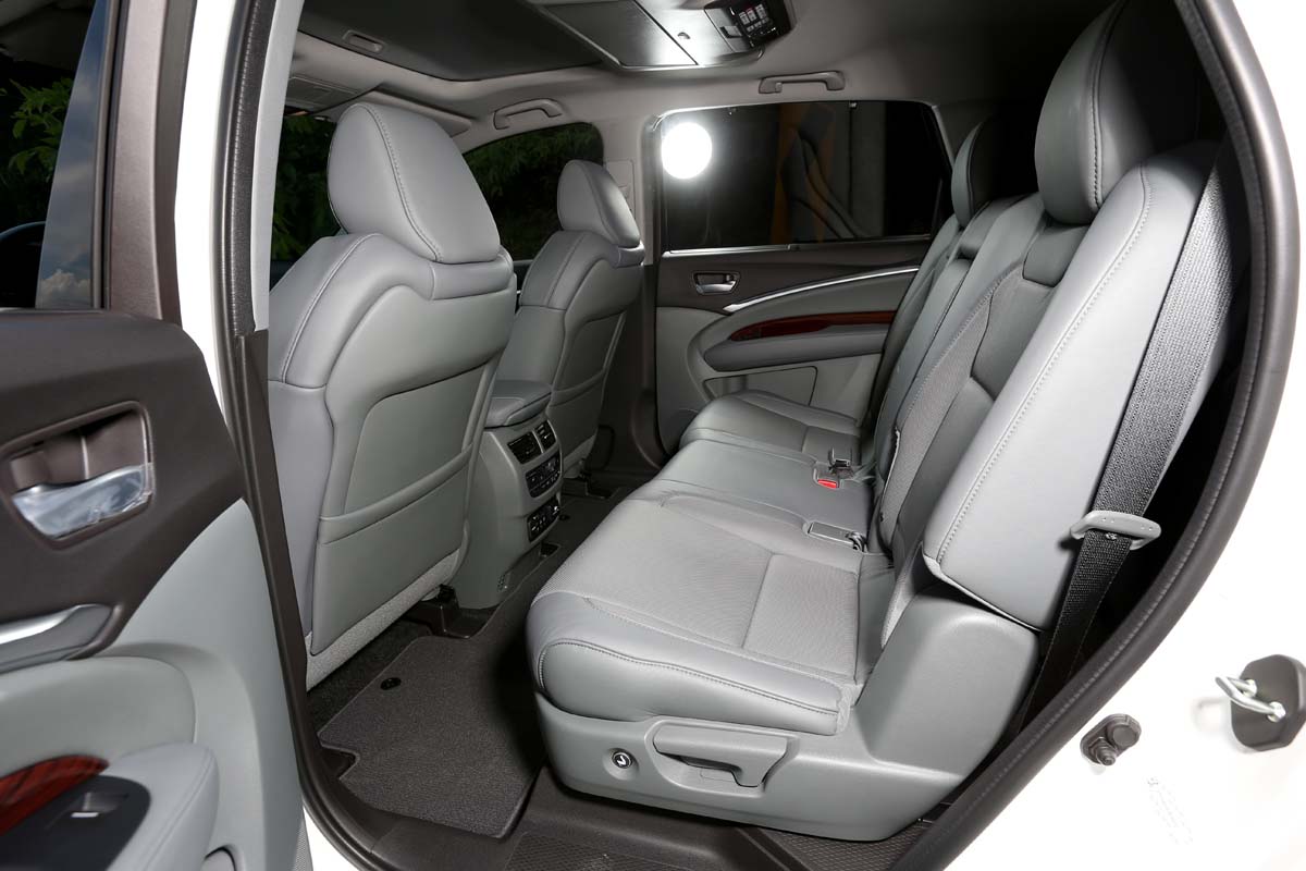 從車長4917mm、軸距2820mm數據來看,七人座休旅車設定的MDX屬於5+2的空間設計,其中第二排坐進172cm成人後,其膝部還保有相當充裕的餘裕空間,且座椅泡棉的設定也提供頗為舒適的乘坐感受。至於坐進第三排後,乘客腿部是會被第二排椅背壓迫,若要獲得改善就必須犧牲第二排的空間,同時,頭部也會因C柱設計而感到壓迫,因此第三排較不適合一般成人乘坐。
