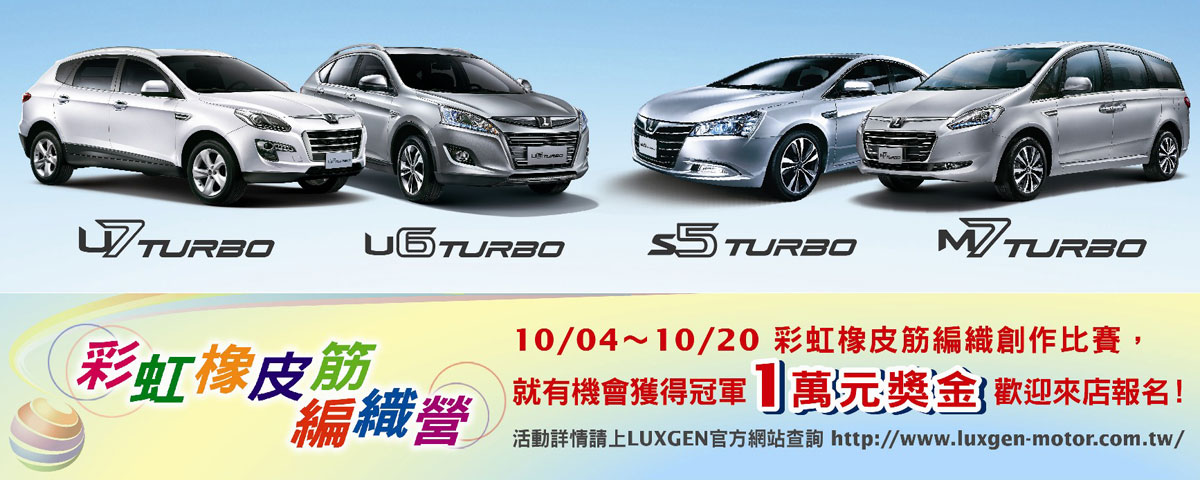 此外,一向深獲大人小孩喜愛的LUXGEN假日展間活動,現在又有了新創意!本月份特別推出「LUXGEN彩虹橡皮筋編織營」,讓小朋友彼此間熱傳的橡皮筋編織遊戲更具啟發性,除了邀請編織達人至展間舉辦巡迴教學之外,還可以讓小朋友的作品參加創意比賽,優選可獲得獎金與贈品(各區冠軍10000元、亞軍5000元、季軍3000元,另擇佳作3名、上傳照片者抽3名,上述所有得獎者皆可得到編織彩虹材料盒),活動當天消費者賞車試乘還贈送彩虹圈一包(600條),欲知詳細活動時間及內容,請參閱官網http://www.luxgen-motor.com.tw/活動訊息。