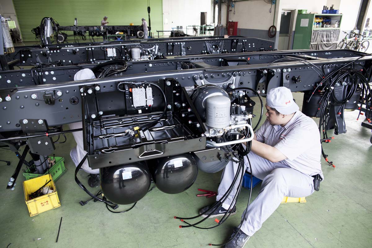 Actros車系的生產線流程大致上與Fuso重車生產線一樣,這些重型車輛組裝關卡的組裝項目相差不大,除了安裝的細部架構和備料區的物料型式因體系不同稍有差異外。在大樑式底盤進廠之後,工作人員第一件事同樣是將底盤先做各式管路的安裝工作,以及各式電線、氣壓閥的繞線與固定,接下來也是在第一站旁進行輪軸的安裝。
