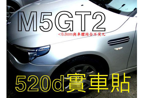 這款集結專業空力導流設計師的BMW 5系列專用葉子板空力套件,安裝後可擁有M5 Look霸氣外觀,不需花費上萬元台幣,且具全球唯一葉子板免開孔不破壞車體之多國專利設計,3分鐘快速安裝,而時尚霧面底座加上導流片有多款鍍鉻顏色可供選擇,為造型質感加分,其類鯊魚鰓設計,導流片向左右延伸,有助於提昇視覺馬力營造出更為霸氣的視覺感受,商品尺寸為長29cm×寬7cm×高1.5cm。