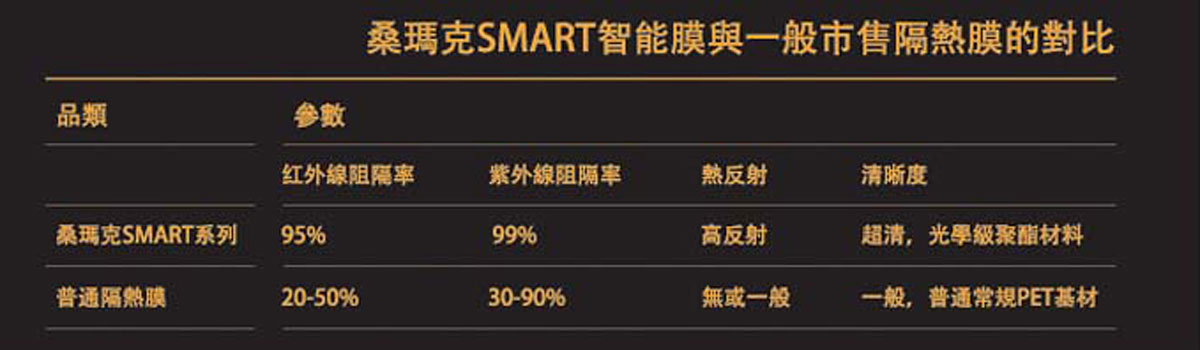 一般來說強調功能性的隔熱紙,視覺效果或美觀與否就不是必要條件,實則不然,桑瑪克國際頂尖團隊透過「紫晶智能光譜篩選技術」,將自動篩選通過可見光並阻隔紅外線與紫外線(高達99%),並分離陽光中的紫色光譜,使其折射出奢華的但紫色,適合追求與眾不同的品味人士。