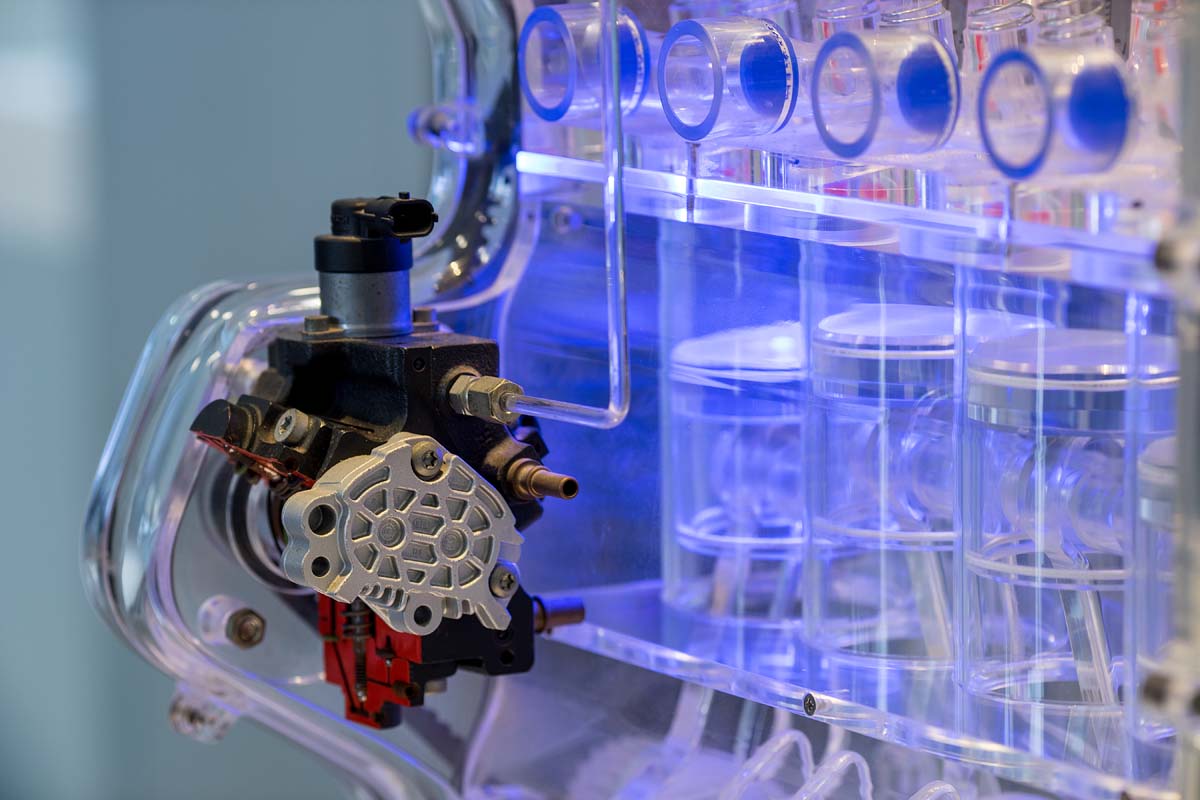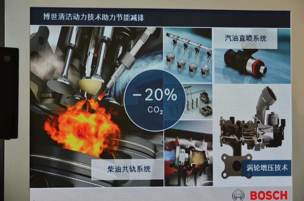 Bosch目前為因應中國政府即將實施的國四排放標準,已研發出商用/乘用車柴油共軌系統。此系統由共軌噴油器、高壓泵、高壓軌、電控單元等構成。高壓泵在高壓油軌中產生獨立於引擎速度和噴油量的壓力,再直接由噴油器將燃油噴入燃燒室。整個過程由電控單元來監控。此系統除了可減少排放、降低油耗和噪音之外,更能提高舒適性。另一方面,目前相當流行的怠速自動啟閉系統,Bosch相繼推出了高級版和滑行版,前者在車速低於20km/h時會自動熄火,後者則可在車速低於120km/h的行進間讓引擎熄火,進一步降低10%的油耗。