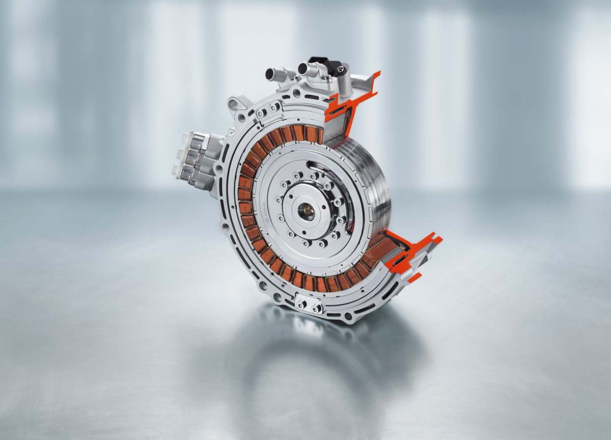 | 針對新能源車輛,Bosch提供兩種不同的永磁同步馬達:分離式和同軸式馬達,以適用不同程度的新能源動力型式。圖為同軸式馬達剖面。 |