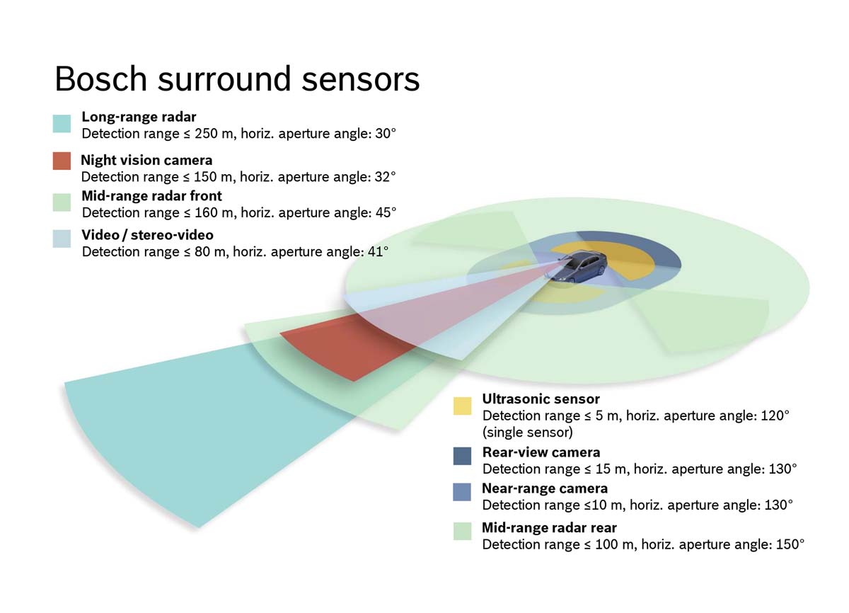 近年來,Bosch持續開發駕駛輔助系統,透過雷達、視訊及超音波等傳感裝置,透過監測將處理後的信息提供給駕駛者。採用永久給汽車使用的77Ghz頻段,Bosch中距離雷達傳感器已於2013年投產,而2014年投產的雙目攝影機視訊傳感器,能夠符合Euro NCAP所有最新要求。至於廣角視訊傳感器擁有360°視角,可覆蓋車輛周圍完整的近距離區域。超音波傳感器可應用於停車輔助的距離測量功能,是成本優化的解決方案。這些科技組成的駕駛輔助系統,將從今年起在中國的自主品牌車款上量產。