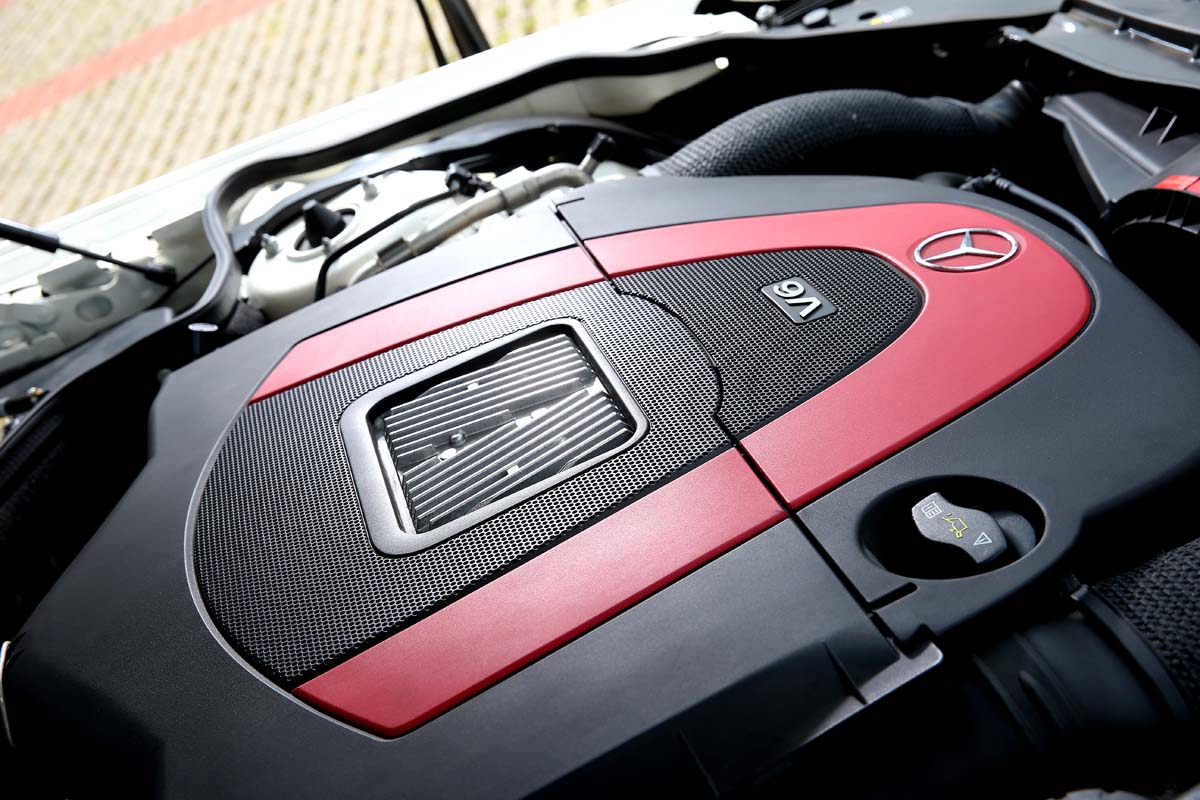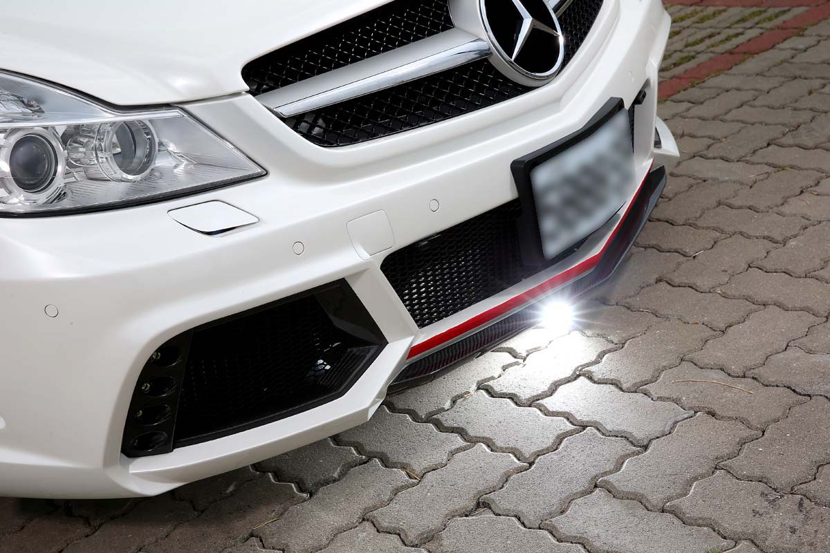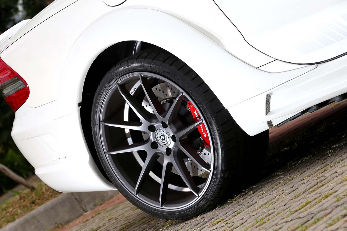 此外,SL 350原廠動力輸出用來應付高達1.5噸的車重其實只能算堪用,為了能夠有更好的動力輸出效能與排氣聲浪,特別交由摩司國際升級Techtec電腦晶片,配合手工全段排氣管的更換,最大馬力推估可提升至330hp,雖然馬力升級幅度不算大,但是飽滿而高亢的引擎聲浪,所營造出的怒吼聲勢絲毫不容任何對手侵犯。至於在底盤方面,採用德國artFORM懸壓鑄造鋁圈算是國內相當罕見的搭配,雖然輪圈規格高達前20*9J、後20*11J,不過重量卻只有11.5~12kg,有效減輕簧下重量負擔,懸吊方面也採用KW V3運動型懸吊,兼具功能與視覺效果。因應整體外觀有了大幅度的升級,原廠煞車在20吋輪圈之內看起來過於「小氣」,為此流用Porsche Cayenne Turbo前六後四活塞卡鉗與380mm碟盤,有效應付任何可能發生的極端操駕所需。
