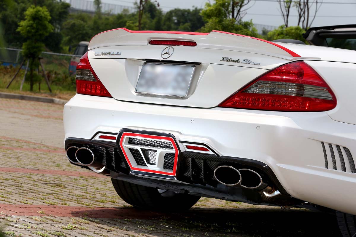 然而眼前這輛M.Benz SL 350雖然算是高價敞篷車款,但是樸素的外觀似乎無法滿足車主所追求的獨特性,為了能夠將愛車的敞篷獨特性再提升,最終特別委託車藝訂購WALD SL Black Bison Edition空力套件,而彷彿利刃的外觀造型也讓SL原有的跑格轉化為伺機攻擊的利刃,隨時要將道路前方的空氣牆給劃開。其實SL敞篷車的外型本身就具備流線性,為此WALD透過侵略性極為強烈的前保桿提升戰鬥力,採用菱形設計的大型進氣壩、向前延伸的下擾流,配合LED日行燈與紅色飾條點綴下,有別於原廠的外觀造型已經成功打下改裝基礎,而配合寬體套件不僅讓車身充滿肌肉美感,藉由額外新增的散熱導孔更可有助於引擎散熱及空氣力學。車尾部分除了後保桿兩側融入氣流導孔以呼應鯊魚鰭的侵略氣勢外,在新增8字型排氣尾飾管以及碳纖維材質製成的分流器,加上微微往上翹的小鴨尾翼,藉由WALD空力套件改裝後的視覺效果,完全呈現出截然不同是新氣象。