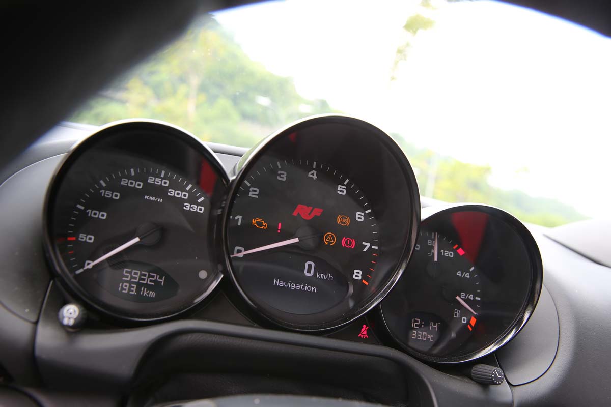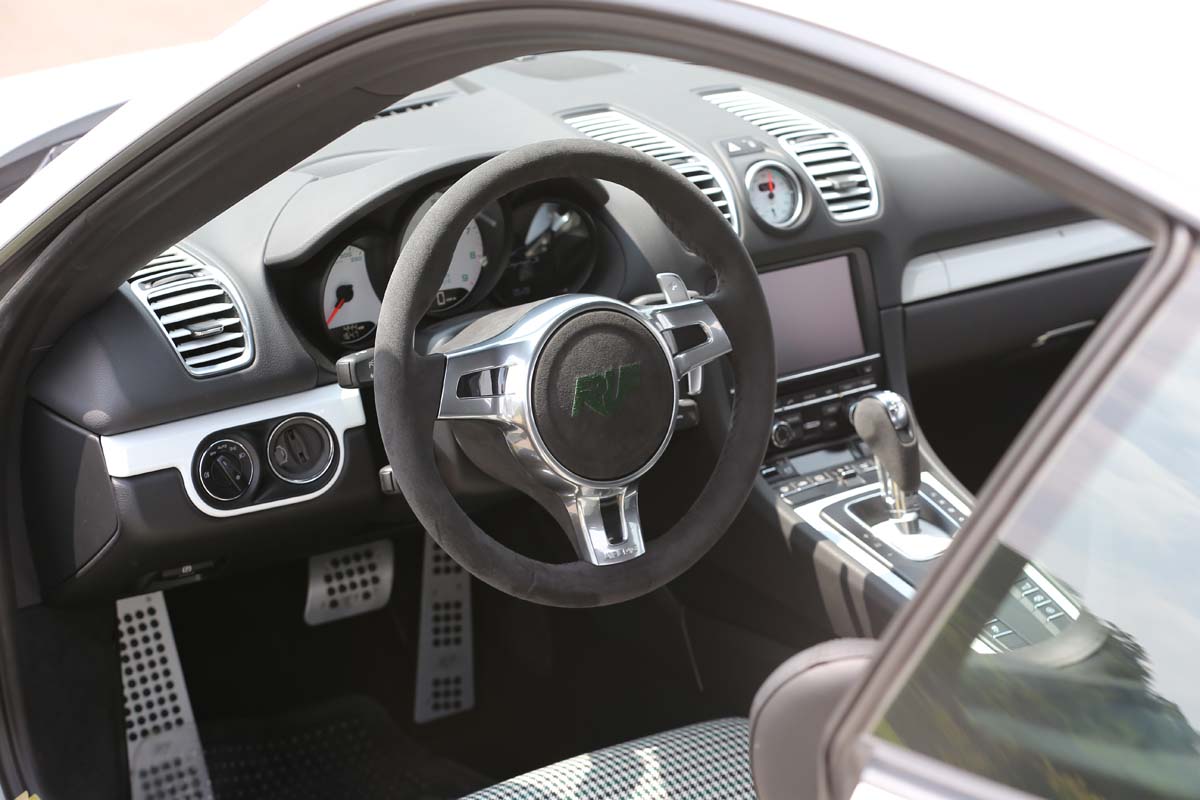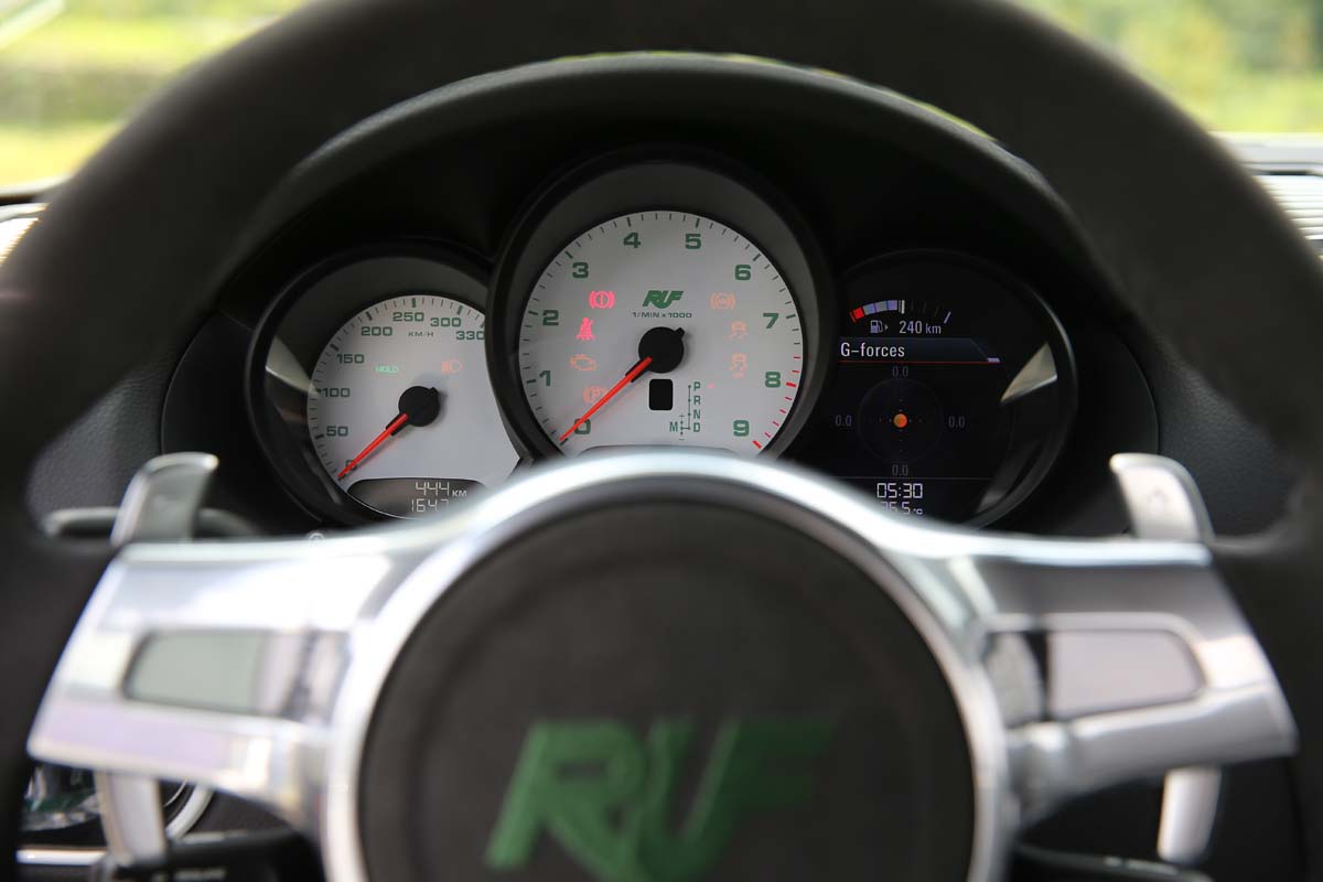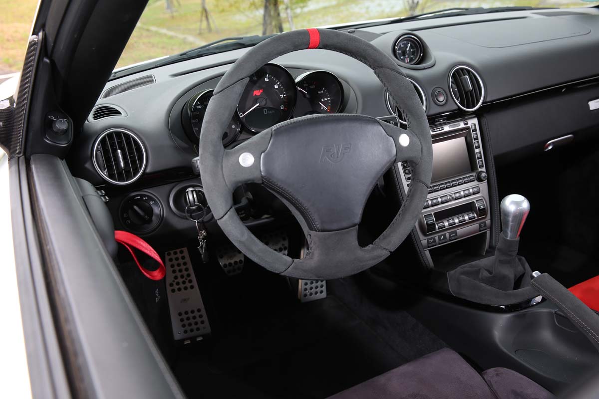| 以Cayman S Sport為基礎的儀錶板為求輕量化而捨棄原有的上蓋,錶底的Ruf字樣與330km/h極速刻度均說明它的出身。 |