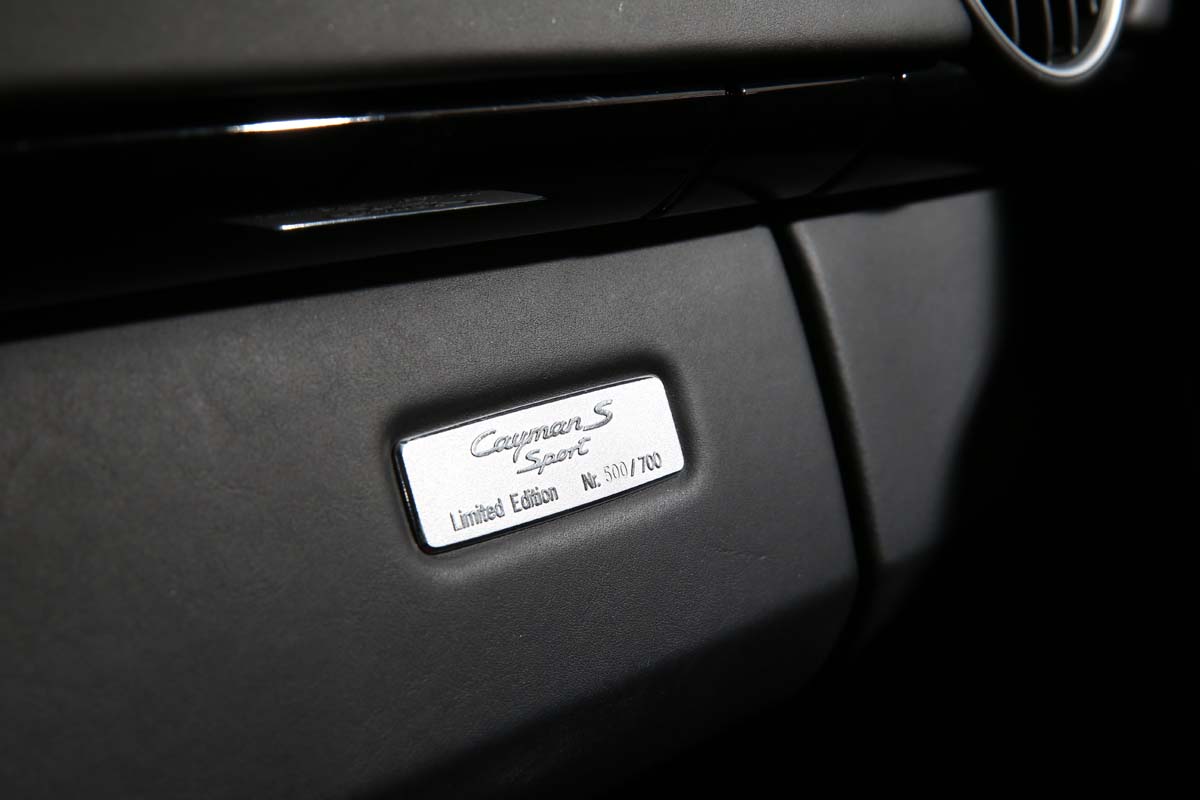 | 手套箱的金屬限量銘牌說明了這部3400K的另一個身分,就是全球限量700部的Cayman S Sport。 |