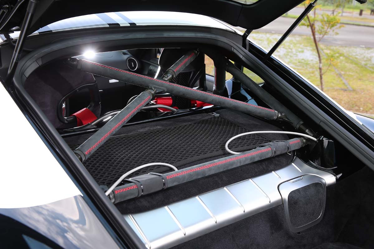 | 為提高車身剛性與安全性,特別加裝Heigo Autotechnik製作的半套式防滾架並以麂皮所包覆。 |