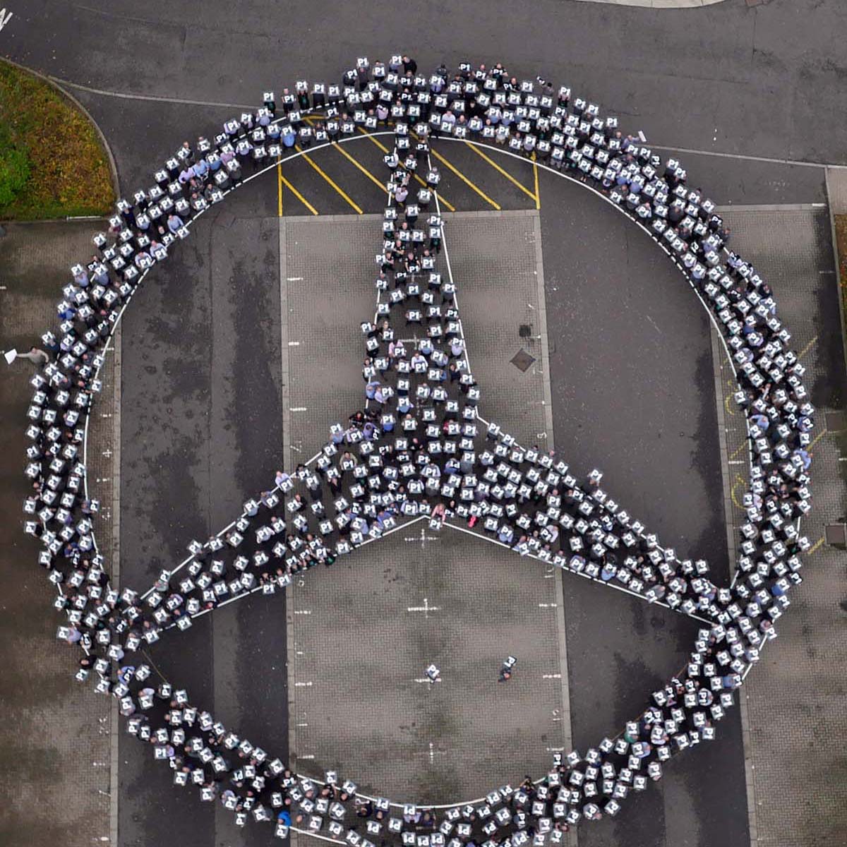 | 確定封王之後,Mercedes工廠人員在總部停車場上排成廠徽圖形,同時每人手上高舉「P1」牌子。 |