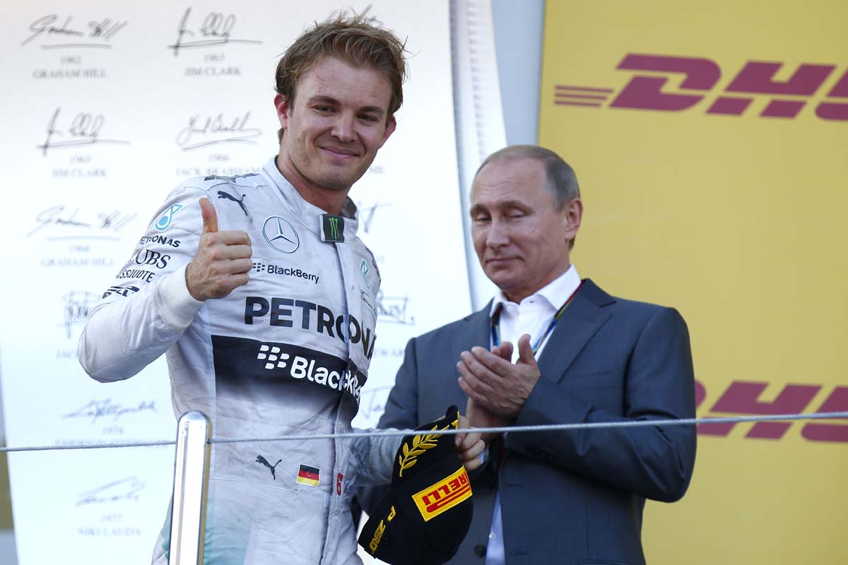 | 我們看過幾次Hamilton掉到後面再追上頒獎台,俄羅斯站Rosberg證明自己也有此能力(或是證明車的能力?)……其實這張圖的重點是戰鬥國家的Putin大統領啦! |